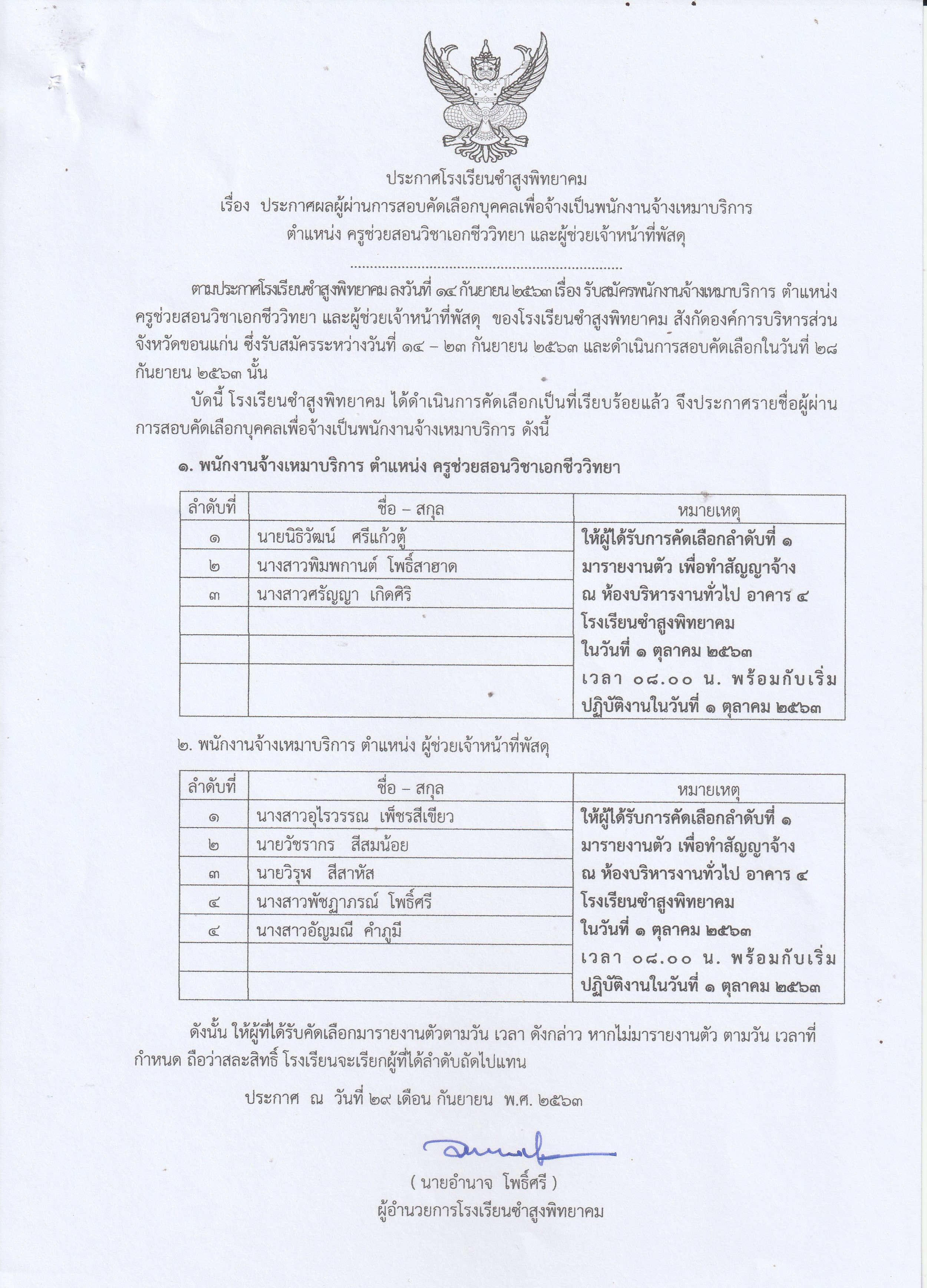 ประกาศผลผู้ผ่านการสอบคัดเลือก เพื่อจ้างเป็นพนักงานจ้างเหมาบริการ ตำแหน่ง ครูช่วยสอนเอกชีววิทยา และตำแหน่งผู้ช่วยเจ้าหน้าที่พัสดุ