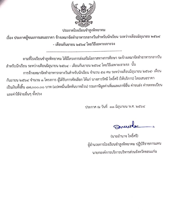 ประกาศผู้ชนะการเสนอราคา จ้างเหมาจัดทำอาหารกลางวันสำหรับนักเรียน ระหว่างเดือนมิถุนายน-เดือนกันยายน2564 โดยวิธีเฉพาะเจาะจง