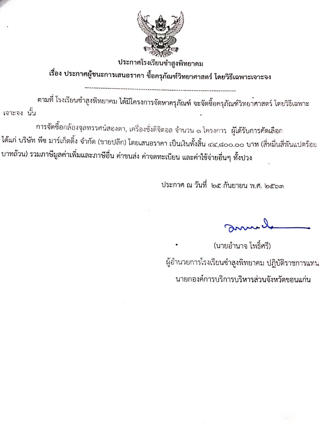 ประกาศโรงเรียนซำสูงพิทยาคม เรื่อง ประกาศผู้ชนะการเสนอราคา ซื้อครุภัณฑ์์วิทยาศาสตร์ โดยวิธีเฉพาะเจาะจง