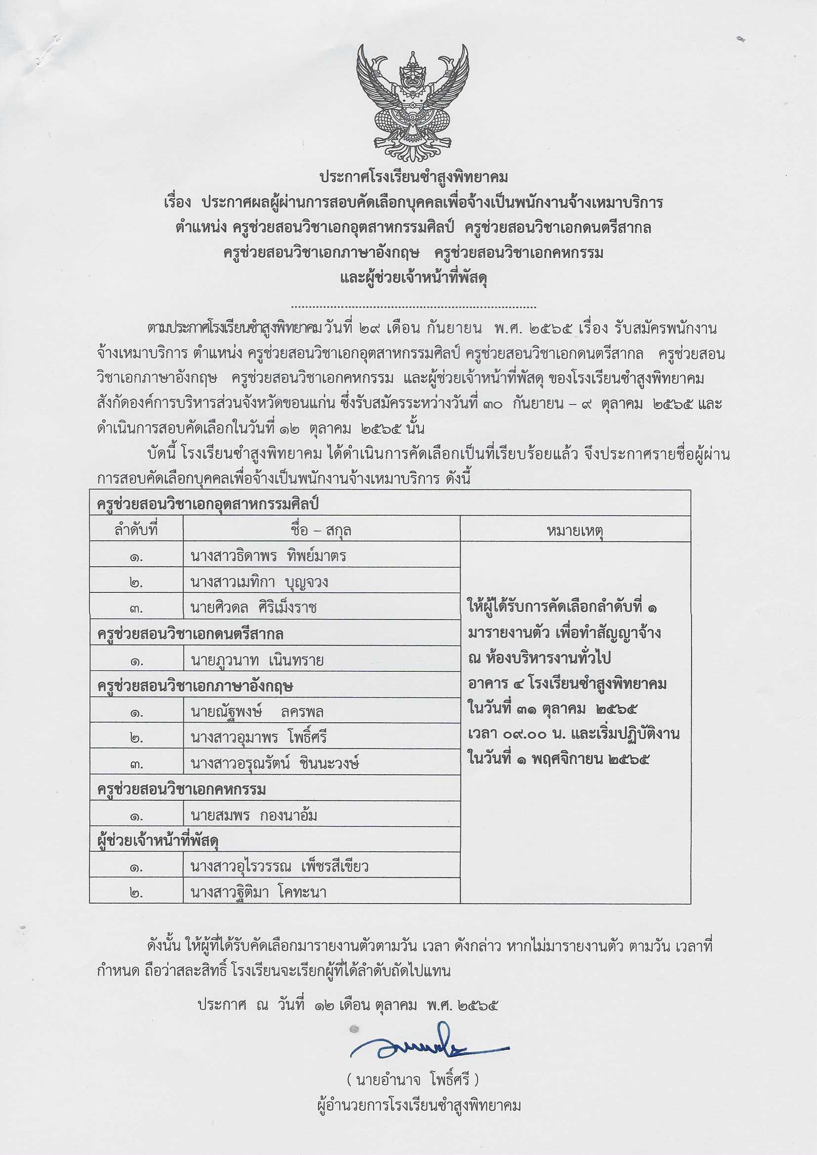 ประกาศโรงเรียนซำสูงพิทยาคม เรื่อง ประกาศผลผู้ผ่านการสอบคัดเลือกบุคคลเพื่อจ้างเป็นพนักงานจ้างเหมาบริการ ตำแหน่ง ครูช่วยสอนวิชาเอกอุตสาหกรรมศิลป์ ครูช่วยสอนวิชาเอกดนตรีสากล ครูช่วยสอนวิชาเอกภาษาอั