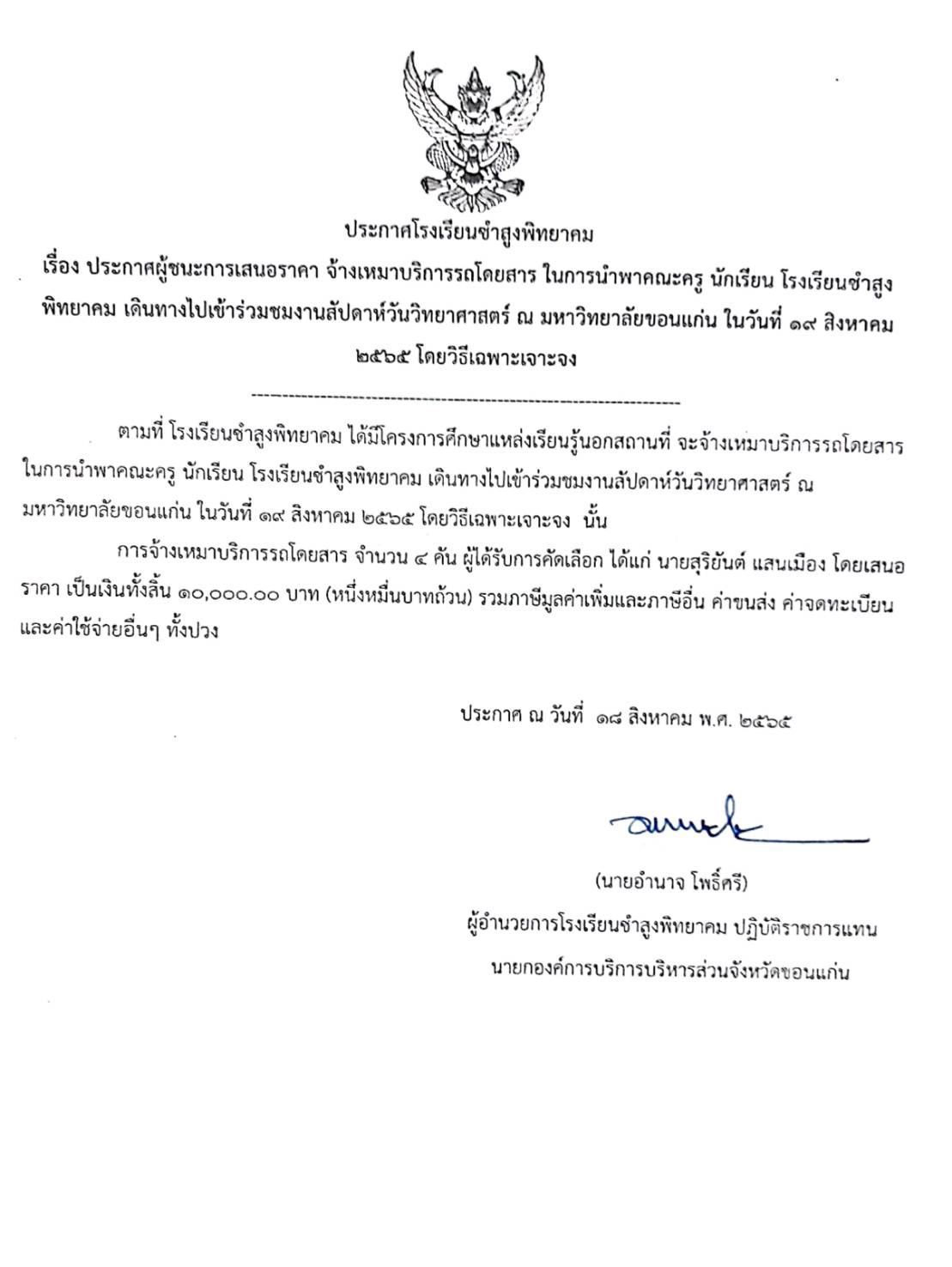 ประกาศโรงเรียนยำสูงพิทยาคม เรื่อง ประกาศผู้ชนะการเสนอราคา จ้างเหมาบริการรถโดยสาร ในการนำพาคณะครู นักเรียน โรงเรียนซำสูง ยาคม เดินทางไปเข้าร่วมชานสัปดาห์วันวิทยาศาสตร์ ณ มหาวิทยาลัยขอนแก่น ในวันที่๑๙ ส