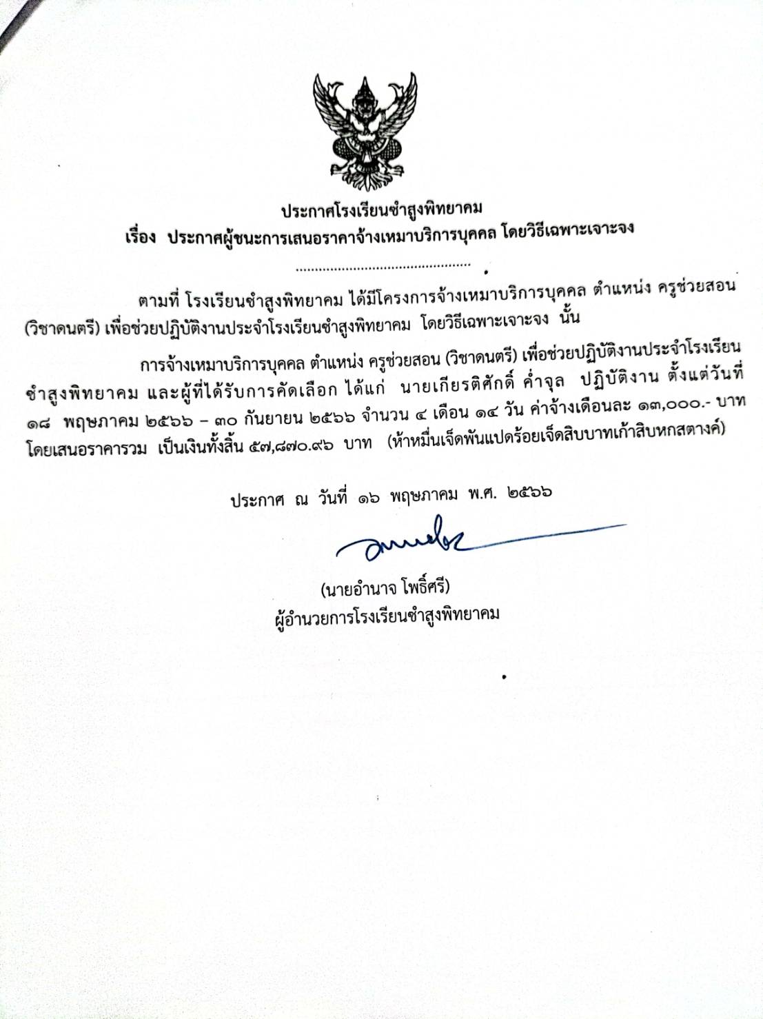 ประกาศโรงเรียนชำสูงพิทยาคมเรื่อง ประกาศผู้ชนะการเสนอราคาจ้างเหมาบริการบุคคล โดยวิซีเฉพาะเจาะจง