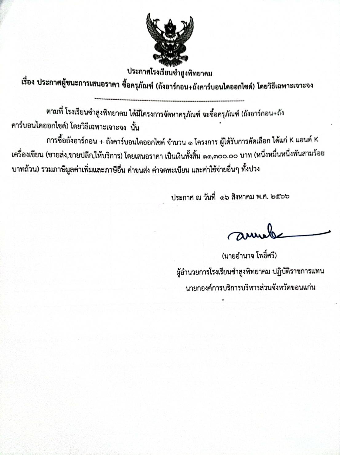 ประกาศโรงเรียนชำสูงพิทยาคม เรื่อง ประกาศผู้ชนะการเสนอราคา ซื้อครุภัณฑ์ (ถังอาร์กอน+ถังคาร์บอนไดออกไซค์) โดยวิธีเฉพาะเจาะจง