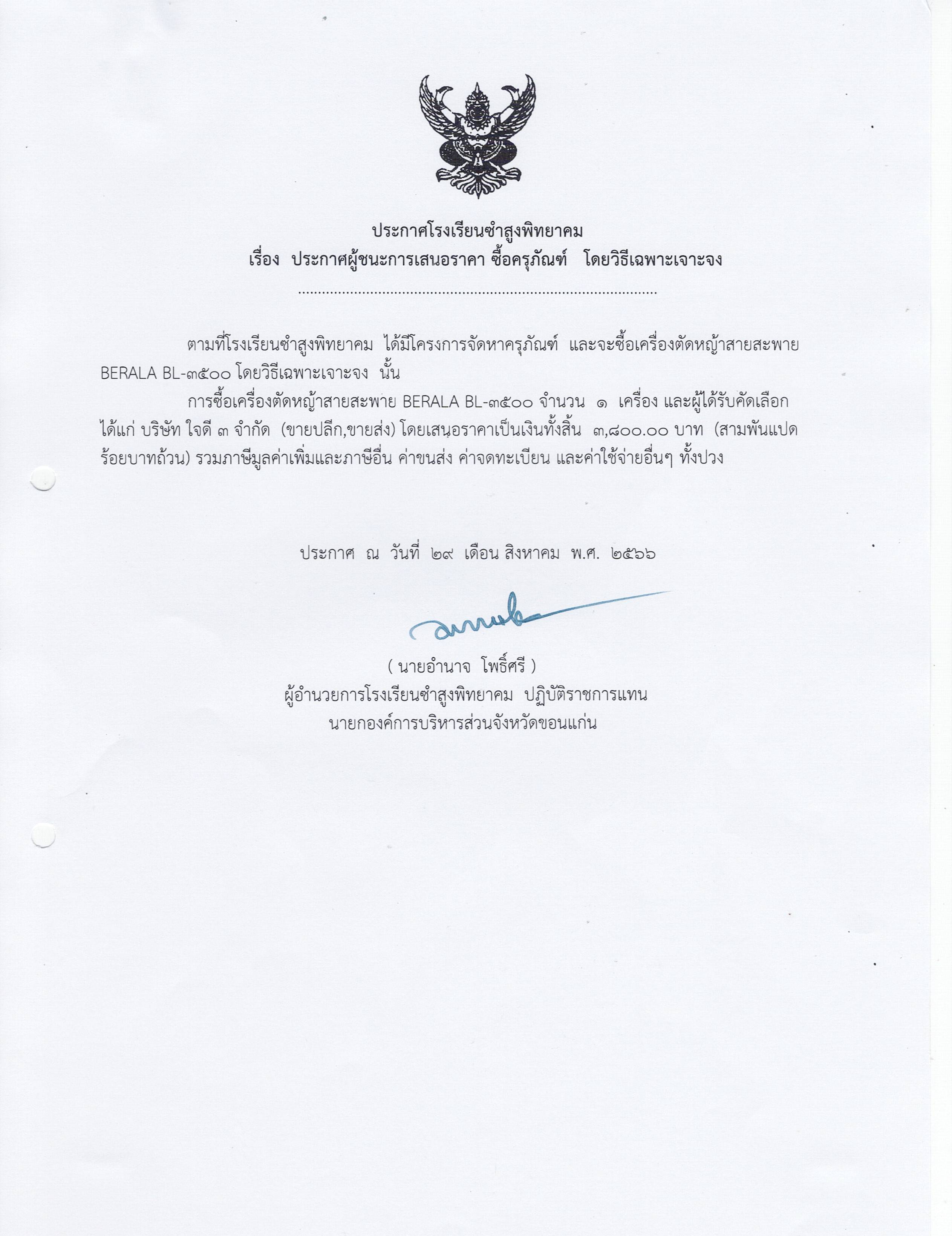 ประกาศโรงเรียนซำสูงพิทยาคม เรื่อง ประกาศผู้ชนะการเสนอราคา ซื้อครุภัณฑ์ โดยวิธีเฉพาะเจาะจง