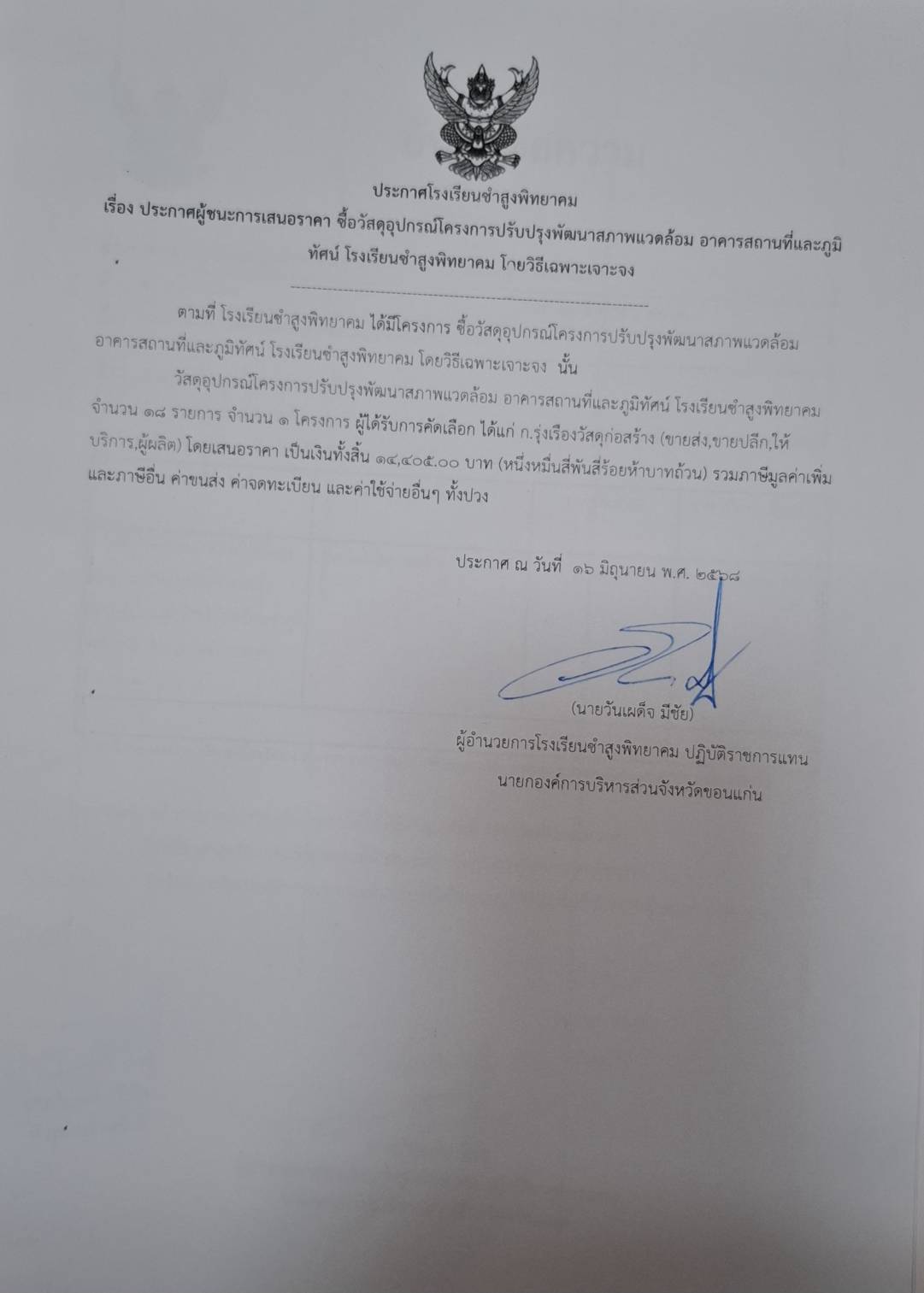ประกาศโรงเรียนซำสูงพิทยาคม เรื่องประกาศผู้ชนะการเสนอราคา จัดซื้อวัสดุอุปกรณ์ โครงการปรับปรุงพัฒนาสภาพแวดล้อม อาคารสถานที่และภูมิทัศน์โรงเรียนซำสูงพิทยาคม โดยวิธีเฉพาะเจาะจง