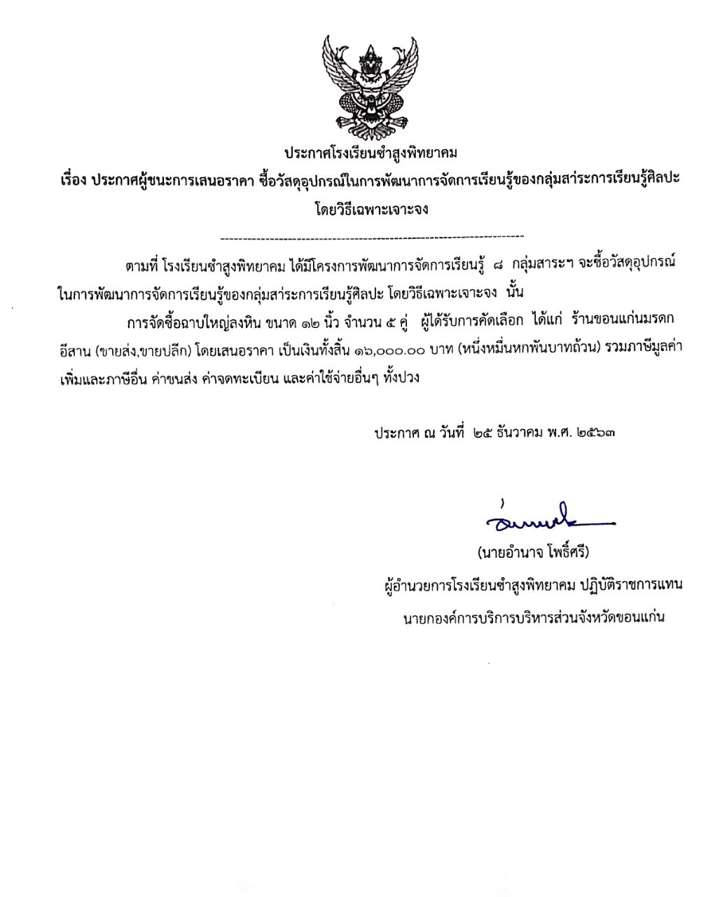 ประกาศผู้ชนะการเสนอราคา ซื้อวัสดุอุปกรณ์ในการพัฒนาการจัดการเรียนรู้ของกลุ่มสาระการเรียนรู้ศิลปะ โดยวิธีเจาะจง