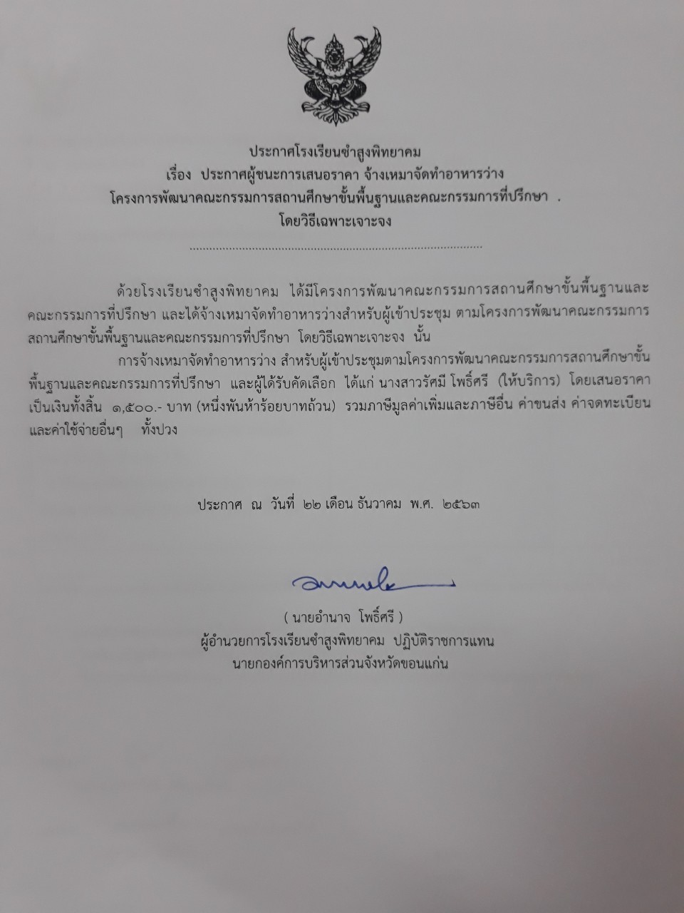 ประกาศผู้ชนะการเสนอราคา จ้างเหมาจัดทำอาหารว่าง โครงการพัฒนาคณะกรรมการสถานศึกษาขั้นพื้นานและคณะกรรมการที่ปรึกษา โดยวิธีเจาะจง