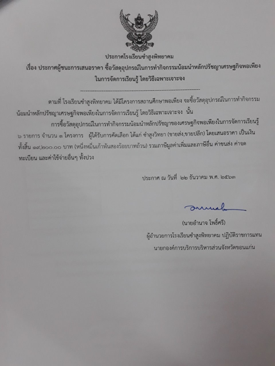 ประกาศผู้ชนะการเสนอราคา ซื้อวัสดุอุปกรณ์ในการทำกิจกรรมน้อมนำหลักปรัชญาเศรษฐกิจพอเพียงในการจัดการเรียนรู้ โดยวิธีเจาะจง