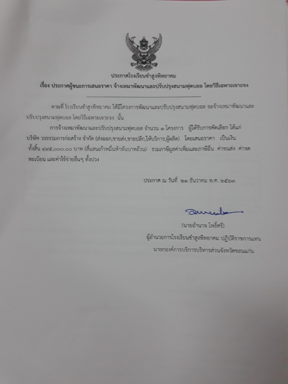 ประกาศผู้ชนะการเสนอราคา จ้างเหมาพัฒนาและปรับปรุงสนามฟุตบอล โดยวิธีเจาะจง