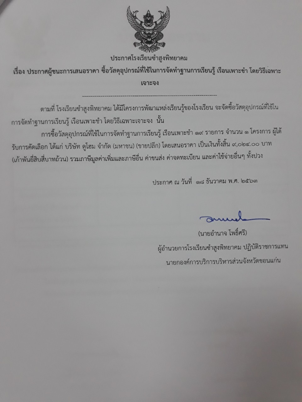 ประกาศผู้ชนะการเสนอราคา ซื้อวัสดุอุปกรณ์ที่ใช้ในการจัดทำฐานการเรียนรู้ เรือนเพาะชำ โดยวิธีเฉพาะเจาะจง