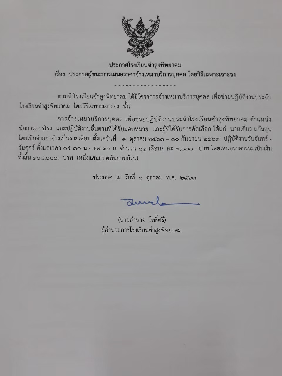 ประกาศผู้ชนะการเสนอราคา จ้างเหมาบริการบุคคล โดยวิธีเฉพาะเจาะจง