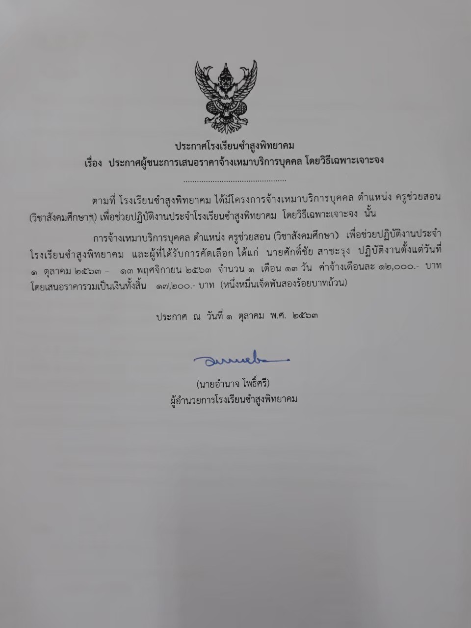 ประกาศผู้ชนะการเสนอราคา จ้างเหมาบริการบุคคล โดยวิธีเฉพาะเจาะจง