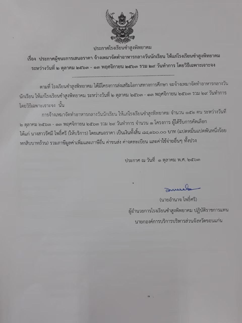 ประกาศผู้ชนะการเสนอราคา จ้างเหมาจัดทำอาหารกลางวันนักเรียน ให้แก่โรงเรียนซำสูงพิทยาคมระหว่างวันที่ ๒ ตุลาคม ๒๕๖๓ - ๑๓ พฤศจิกายน ๒๕๖๓ รวม ๒๙ วันทำการ โดยวิธีเฉพาะเจาะจง