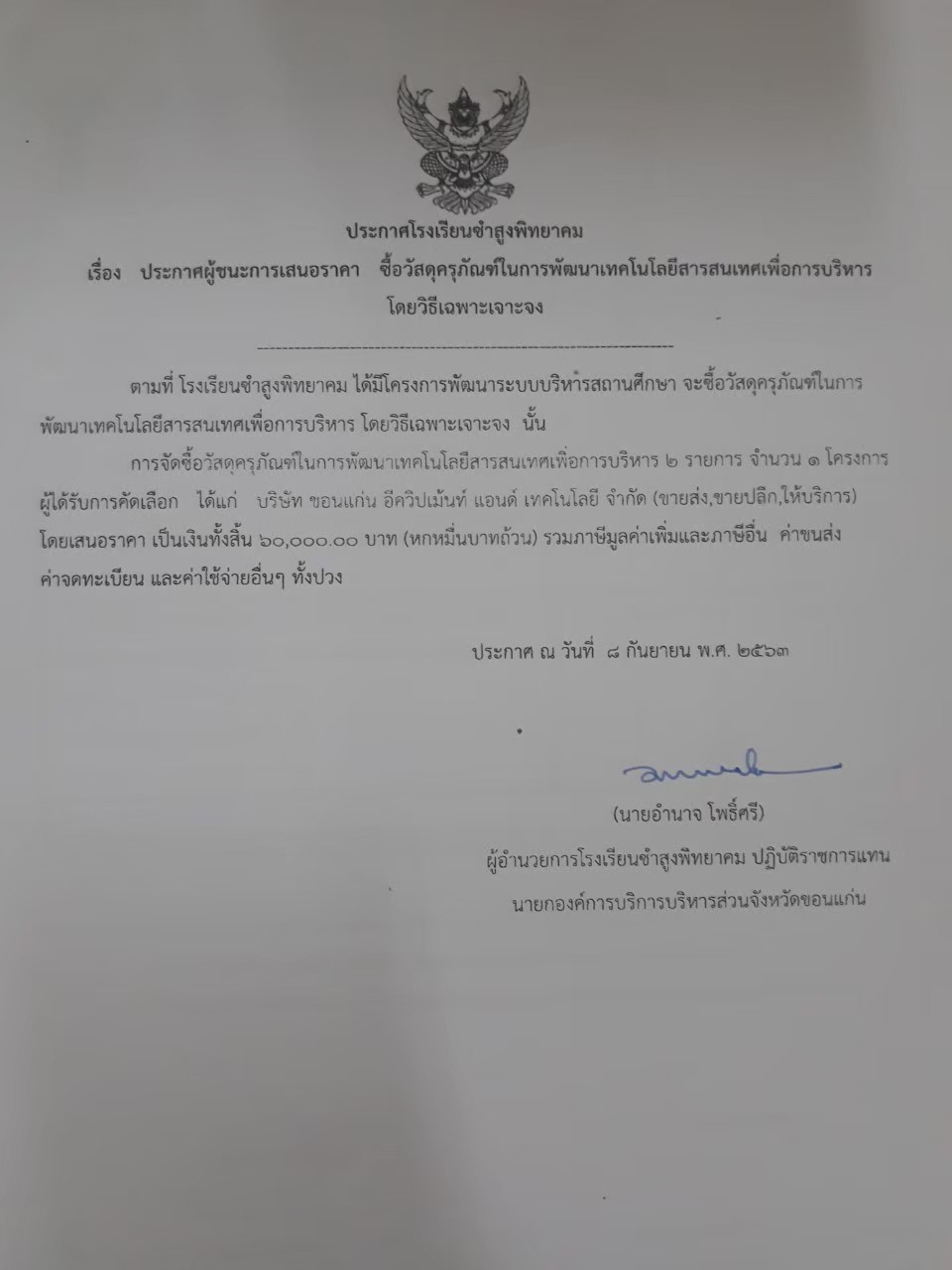 ประกาศผู้ชนะการเสนอราคา ซื้อวัสดุครุภัณฑ์ในการพัฒนาเทคโนโลยีสารสนเทศเพื่อการบริหาร โดยวิธีเฉพาะเจาะจง