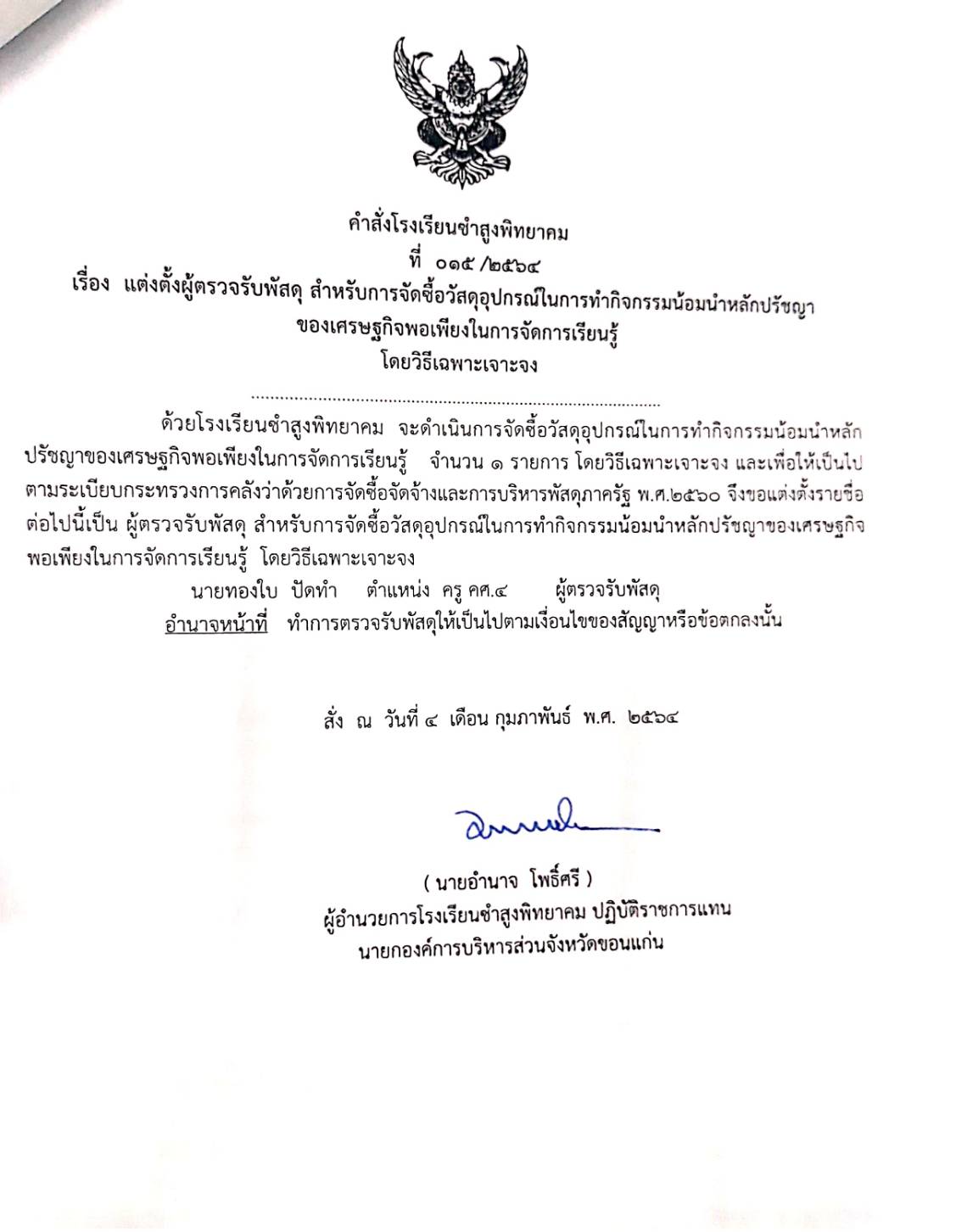 แต่งตั้งผู้รับตรวจพัสดุ สำหรับการจัดซื้อวัสดุอุปกรณ์ในการทำกิจกรรมน้อมนำหลักปรัชญาของเศรษฐกิจพอเพียงในการจัดการเรียนรู้ โดยวิธีเจาะจง