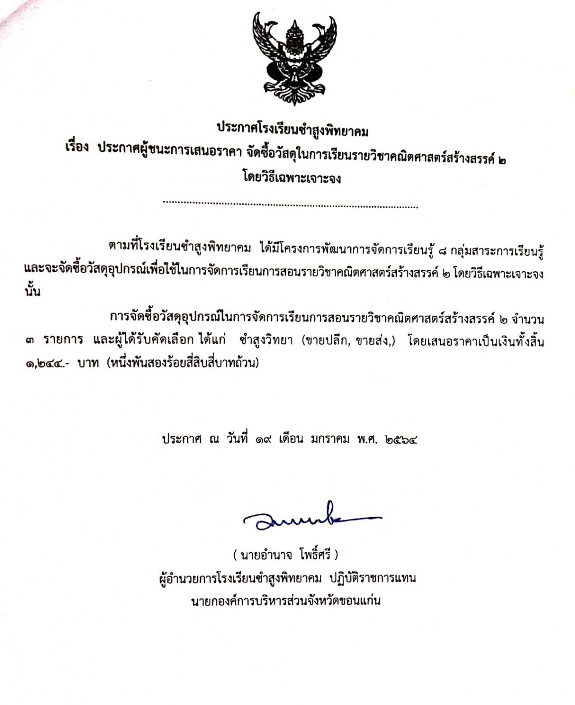 ประกาศผู้ชนะการเสนอราคา จัดซื้อวัสดุในการเรียนรายวิชาคณิตศาสตร์สร้างสรรค์ ๒ โดยวิธีเฉพาะเจาะจง