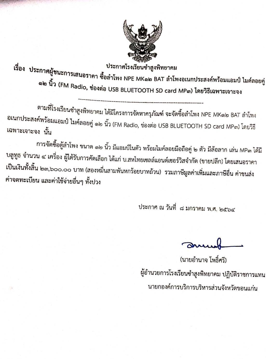 ประกาศผู้ชนะการเสนอราคา ซื้อลำโพง NPE MK ๑๒ BAT ลำโพงอเนกประสงค์พร้อมแอมป์ ไมค์ลอยคู่ ๑๒ นิ้ว (FM Radio, ช่องต่อ USB BLUETOOTH SD card MP๓) โดยวิธีเฉพาะเจาะจง