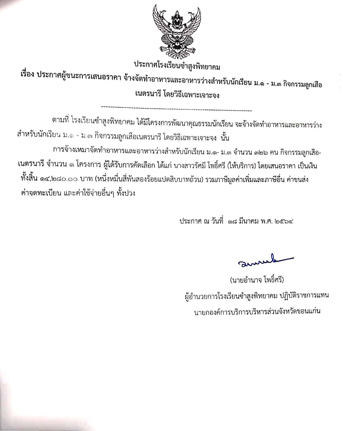ประกาศผู้ชนะการเสนอราคา จ้างจัดทำอาหารและอาหารว่างสำหรับนักเรียน ม.๑-ม.๓ กิจกรรมลูกเสือ เนตรนารี โดยวิธีเฉพาะเจาะจง