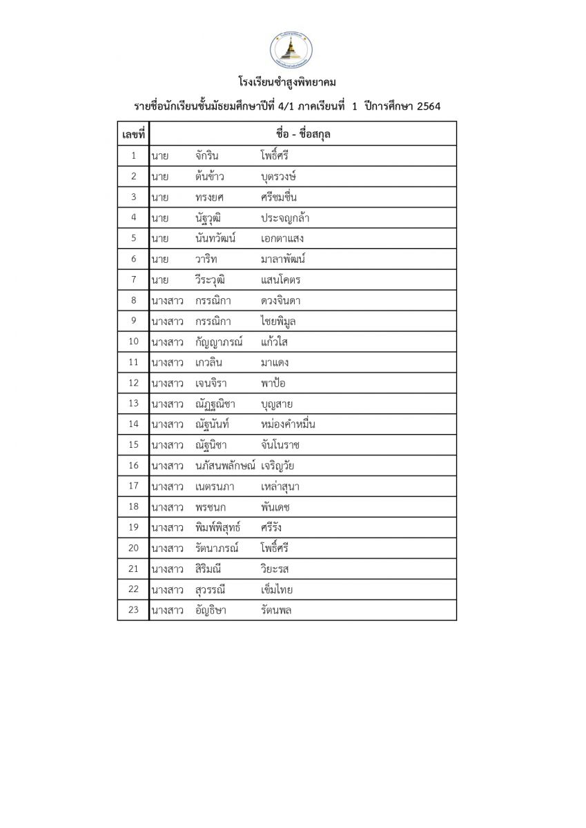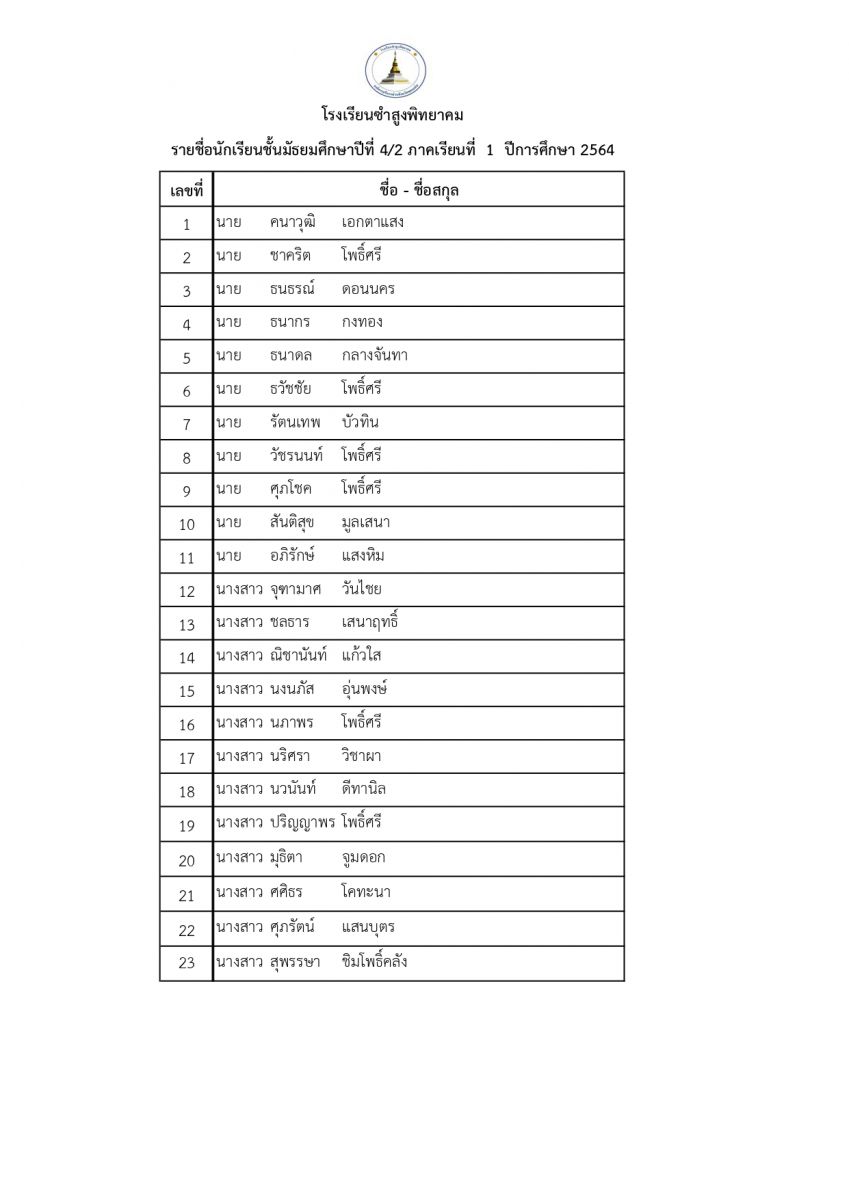 ประกาศรายชื่อนักเรียนชั้นมัธยมศึกษาปีที่ 4 ประจำปีการศึกษา 2564 โรงเรียนซำสูงพืทยาคม แบ่งเป็น 2 สายการเรียน คือ 4/1 (วิทย์-คณิต) , 4/2 (ทั่วไป) และ 4/3 (ทั่วไป)