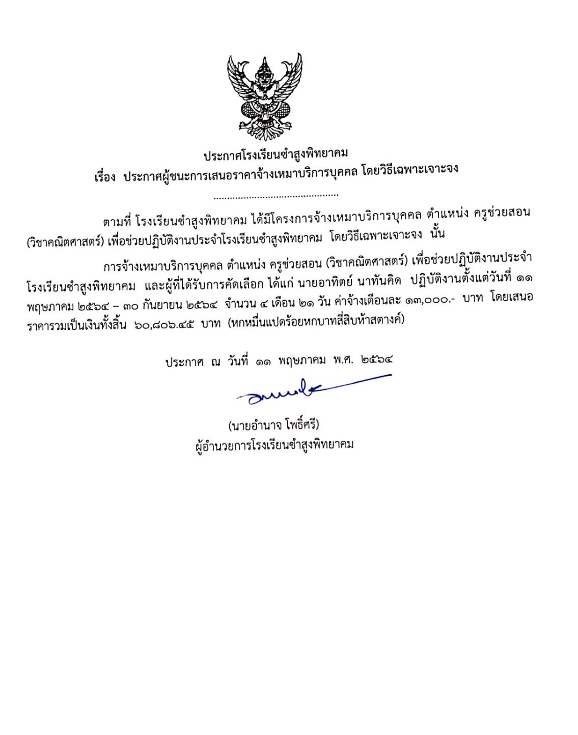 ประกาศผู้ชนะการเสนอราคาจ้างเหมาบริการบุคคล โดยวิธีเฉพาะเจาะจง