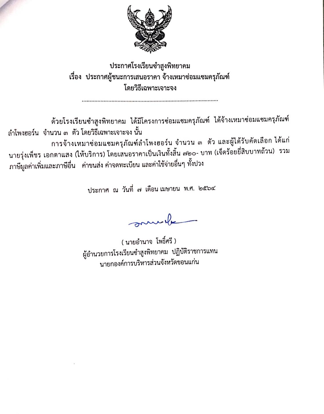ประกาศผู้ชนะการเสนอราคา จ้างเหมาซ่อมแซมครุภัณฑ์ โดยวิธีเฉพาะเจาะจง