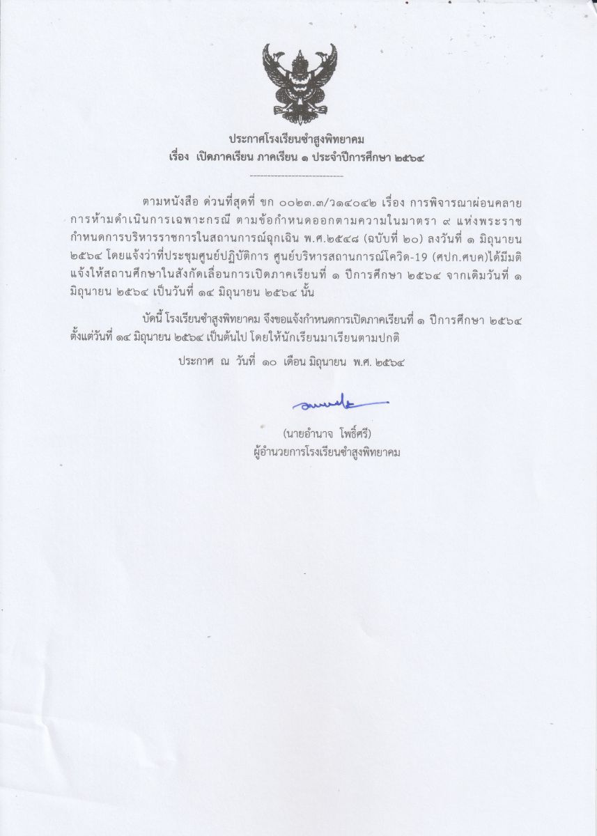 ประกาศ เปิดภาคเรียนที่ 1 ปีการศึกษา 2564