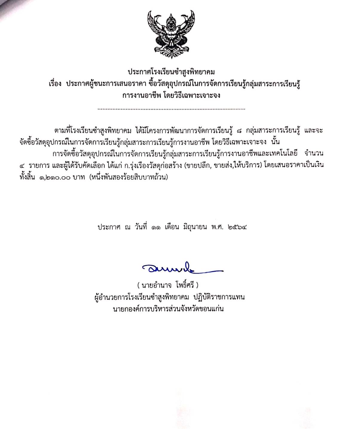 ประกาศผู้ชนะการเสนอราคา ซื้อวัสดุอุปกรณ์ในการจัดการเรียนรู้กลุ่มสาระการเรียนรู้การงานอาชีพ โดยวิธีเฉพาะเจาะจง