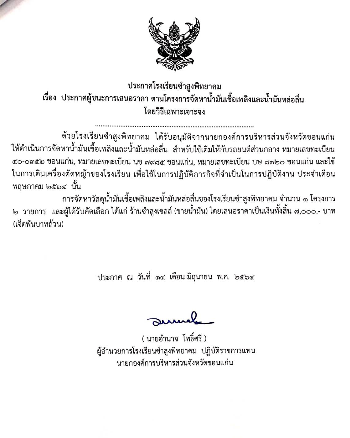 ประกาศผู้ชนะการเสนอราคา ตามโครงการจัดหาน้ำมันเชื้อเพลิงและน้ำมันหล่อลื่น โดยวิธีเฉพาะเจาะจง