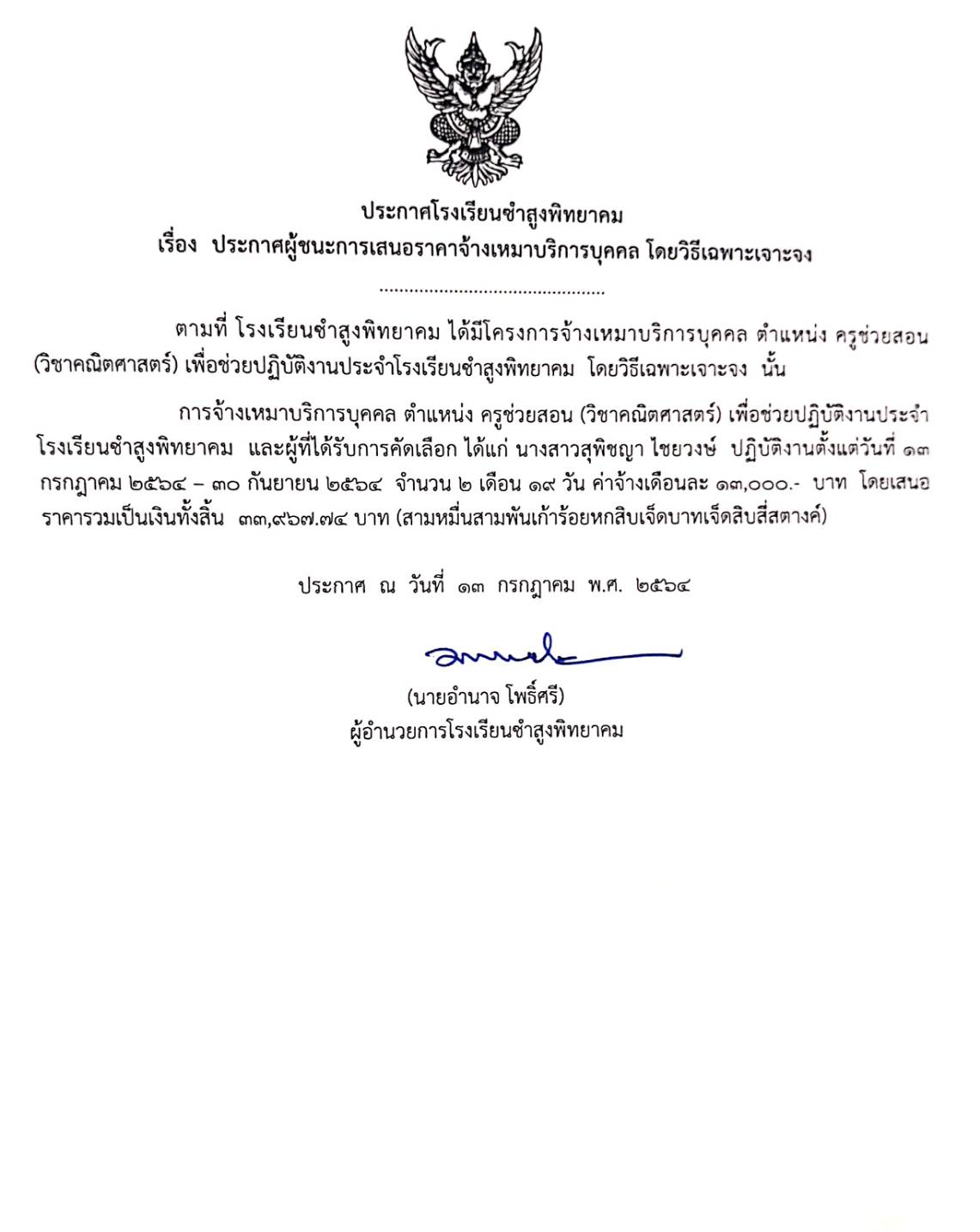 ประกาศผู้ชนะการเสนอราคาจ้างเหมาบริการบุคคล โดยวิธีเฉพาะเจาะจง