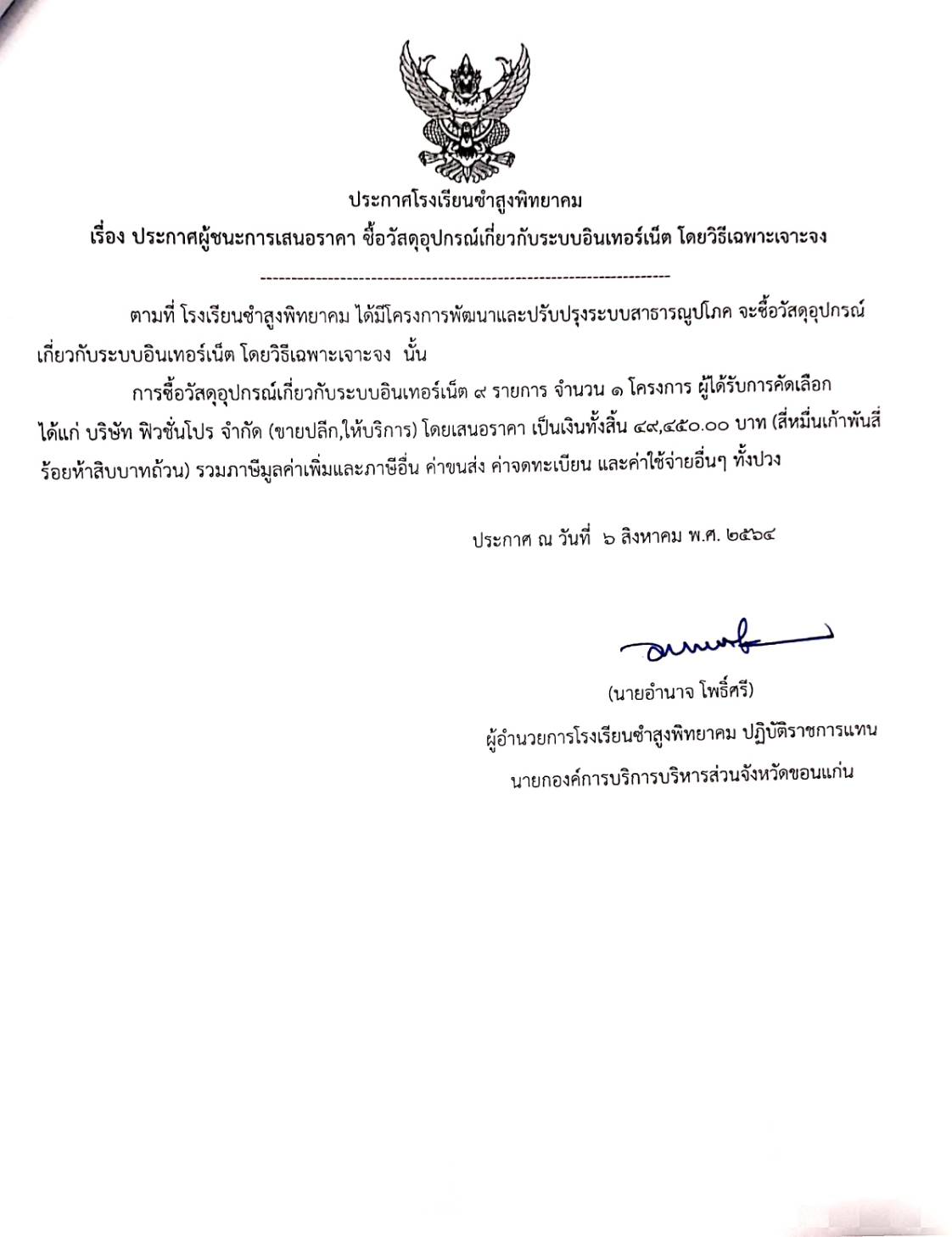 ประกาศโรงเรียนซำสูงพิทยาคม เรื่องประกาศผู้ชนะการเสนอราคา ซื้อวัสดุอุปกรณ์เกี่ยวกับระบบอินเทอร์เน็ต โดยวิธีเฉพาะเจาะจง