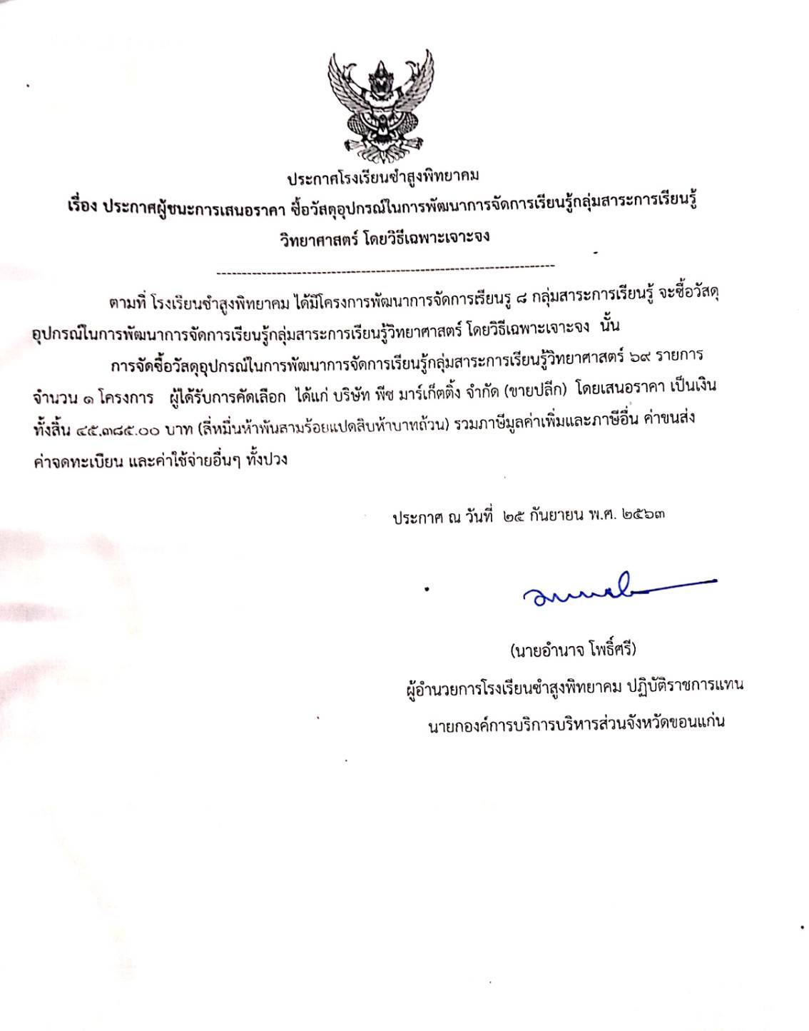 ประกาศโรงเรียนซำสูงพิทยาคม เรื่อง ประกาศผู้ชนะการเสนอราคา ซื้อวัสดุอุปกรณ์ในการพัฒนาการจัดการเรียนรู้กลุ่มสาระการเรียนรู้วิทยาศาสตร์ โดยวิธีเฉพาะเจาะจง