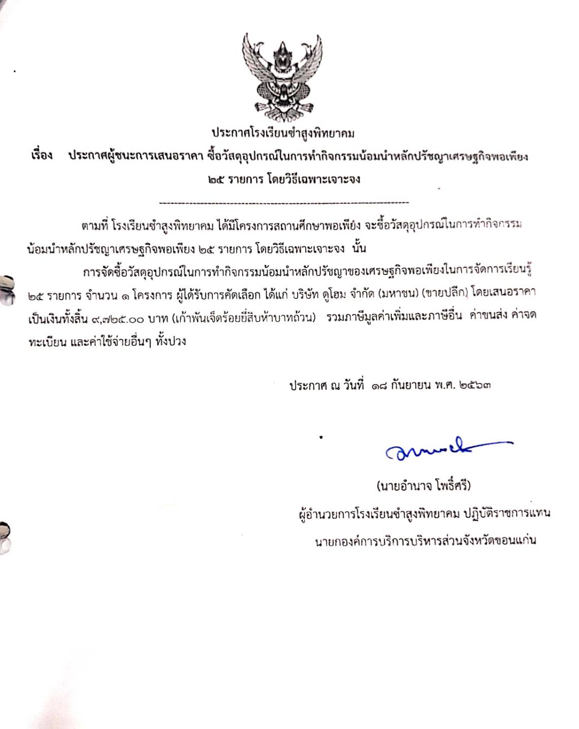 ประกาศโรงเรียนซำสูงพิทยาคม เรื่อง ประกาศผู้ชนะการเสนอราคาซื้อวัสดุอุปกรณ์ในการทำกิจกรรมน้อมนำหลักปรัชญาเศรษฐกิจพอเพียง๒๕รายการ โดยวิธีเฉพาะเจาะจง