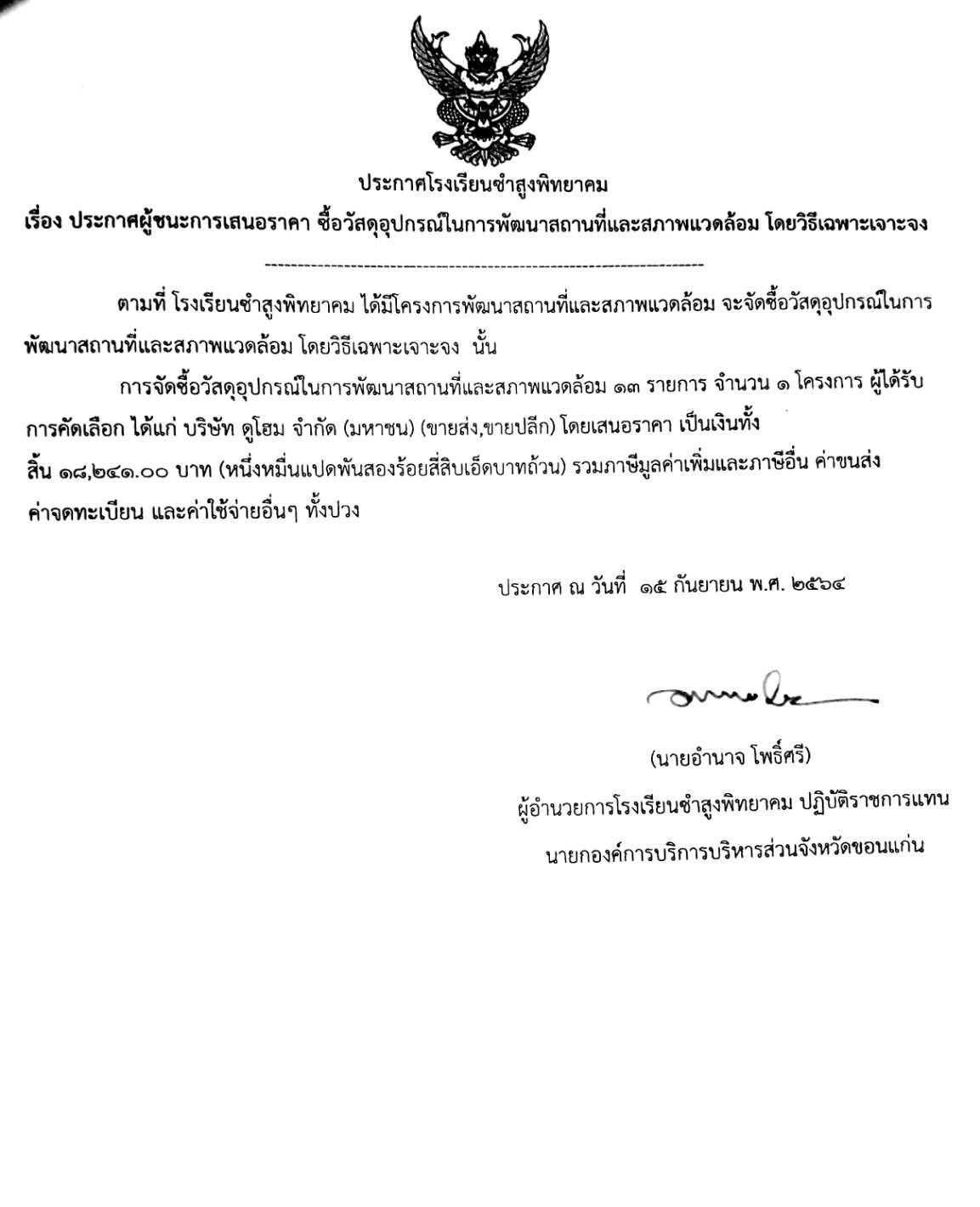 ประกาศโรงเรียนซำสูงพิทยาคม เรื่อง ประกาศผู้ชนะการเสนอราคา จัดซื้อวัสดุอุปกรณ์ในการพัฒนาสถานที่และสภาพแวดล้อม โดยวิธีเฉพาะเจาะจง