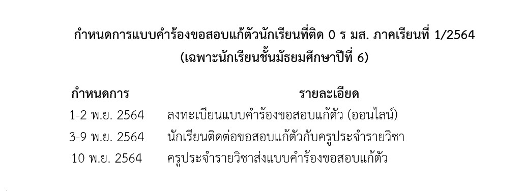 ประกาศ แจ้งนักเรียนชั้นมัธยมศึกษาปีที่ 6 ทุกคน เรื่องแบบคำร้องขอสอบแก้ตัว นักเรียนที่ติด 0 ร มส. ภาคเรียนที่่ 1/2564 โดยลงทะเบียนผ่านระบบออนไลน์ ตามกำหนดการดังนี้