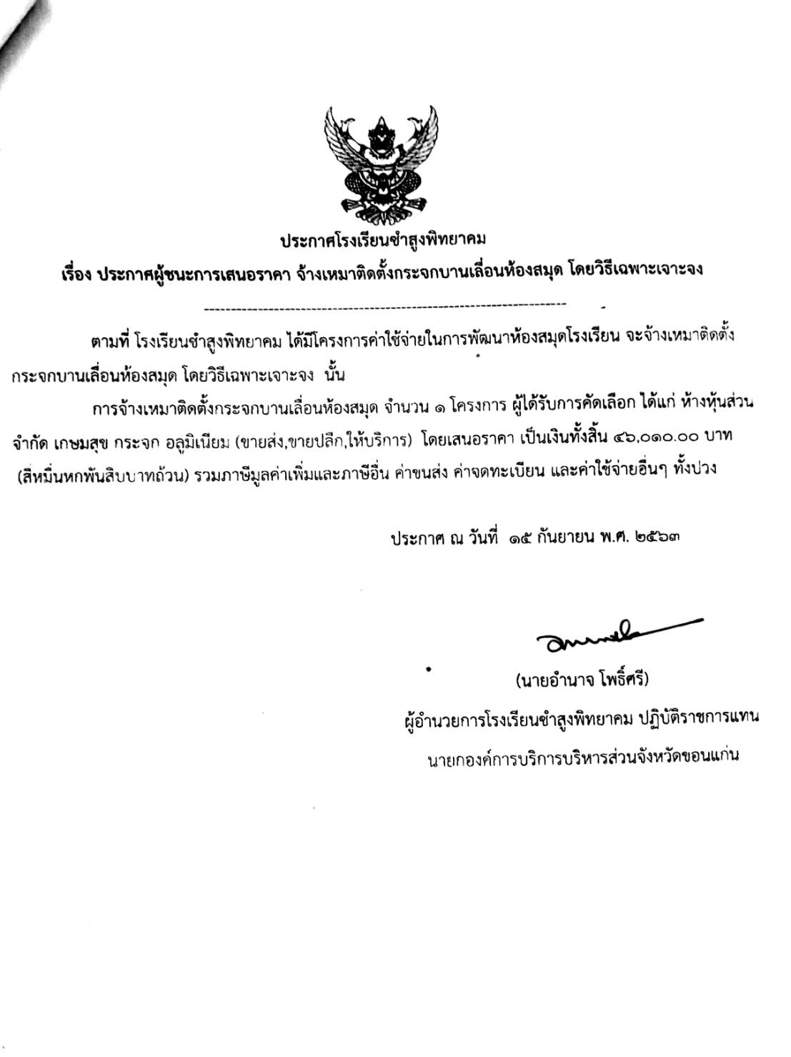 ประกาศโรงเรียนซำสูงพิทยาคม เรื่องประกาศผู้ชนะการเสนอราคา จ้างเหมาติดตั้งกระจกบานเลื่อนห้องสมุด โดยวิธีเฉพาะเจาะจง