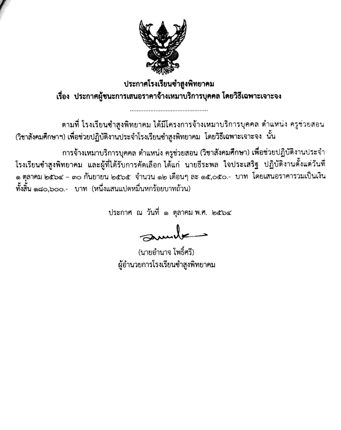 ประกาศโรงเรียนชำสูงพิทยาคม เรื่อง ประกาศผู้ชนะการเสนอราคาจ้างเหมาบริการบุคคล โดยวิธีเฉพาะเจาะจง