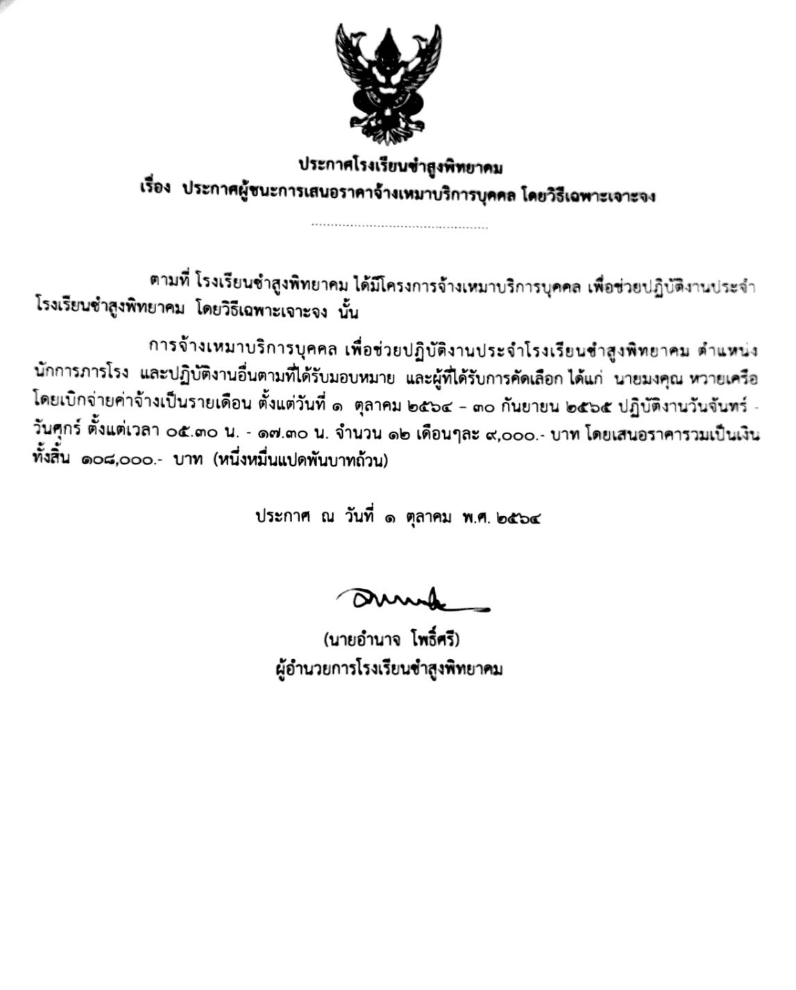 ประกาศโรงเรียนชำสูงพิทยาคม เรื่อง ประกาศผู้ชนะการเสนอราคาจ้างเหมาบริการบุคคล โดยวิธีเฉพาะเจาะจง
