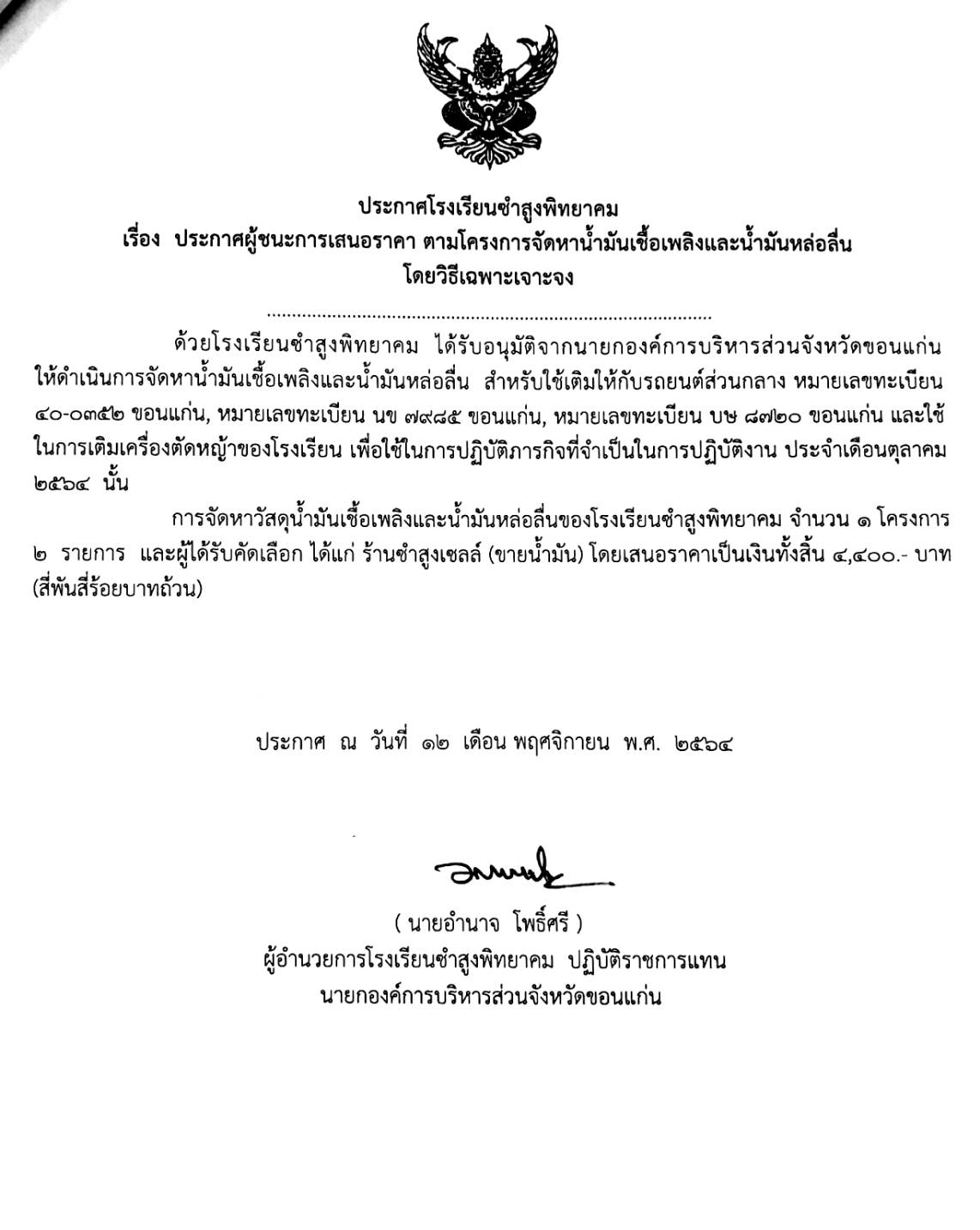 ประกาศโรงเรียนชำสูงพิทยาคม เรื่อง ประกาศผู้ชนะการเสนอราคา ตามโครงการจัดหาน้ำมันเชื้อเพลิงและน้ำมันหล่อลื่น โดยวิธีเฉพาะเจาะจง