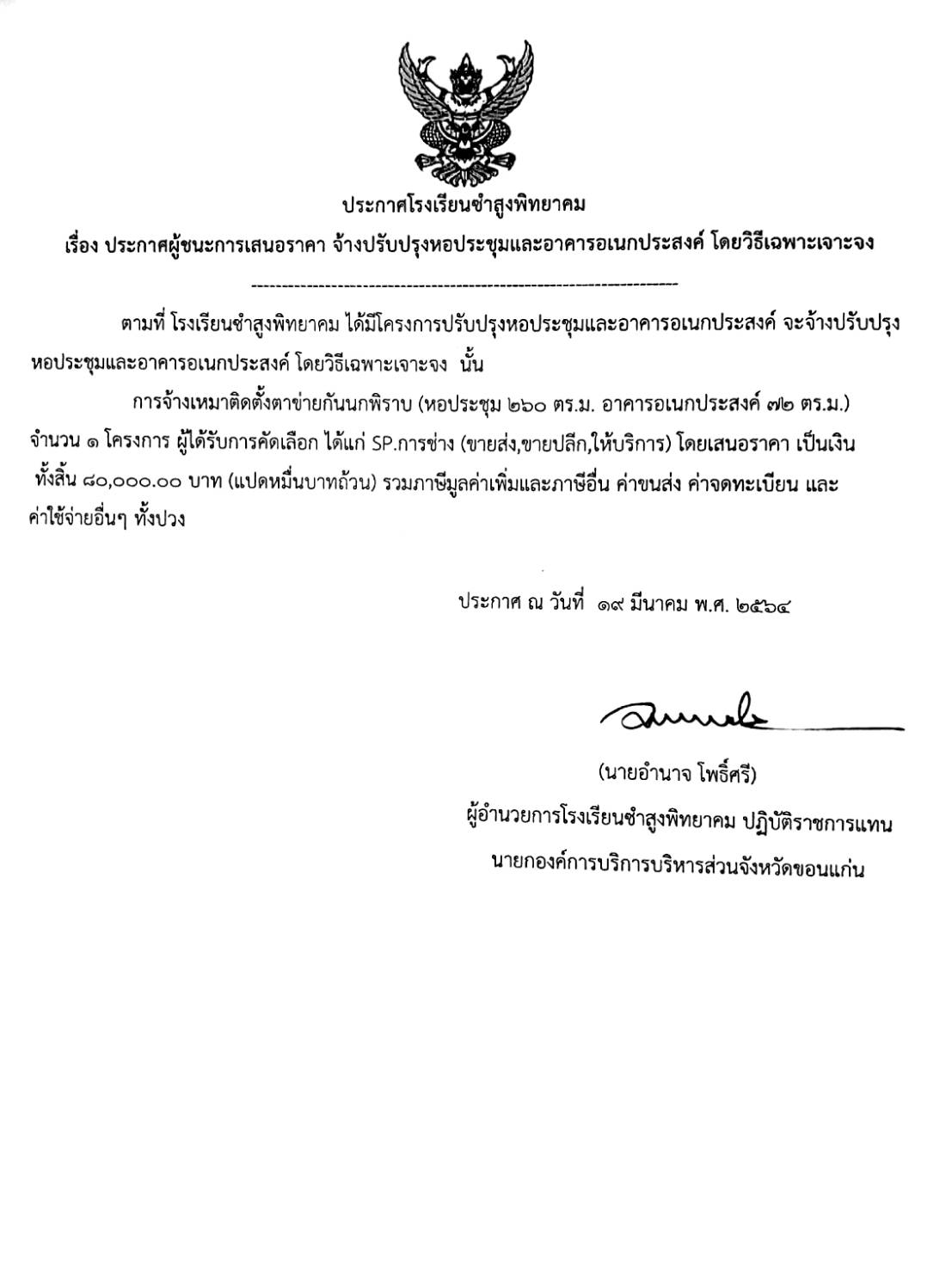 ประกาศโรงเรียนซำสูงพิทยาคม เรื่อง ประกาศผู้ชนะการเสนอราคา จ้างปรับปรุงหอประชุมและอาคารอเนกประสงค์ โดยวิธีเฉพาะเจาะจง