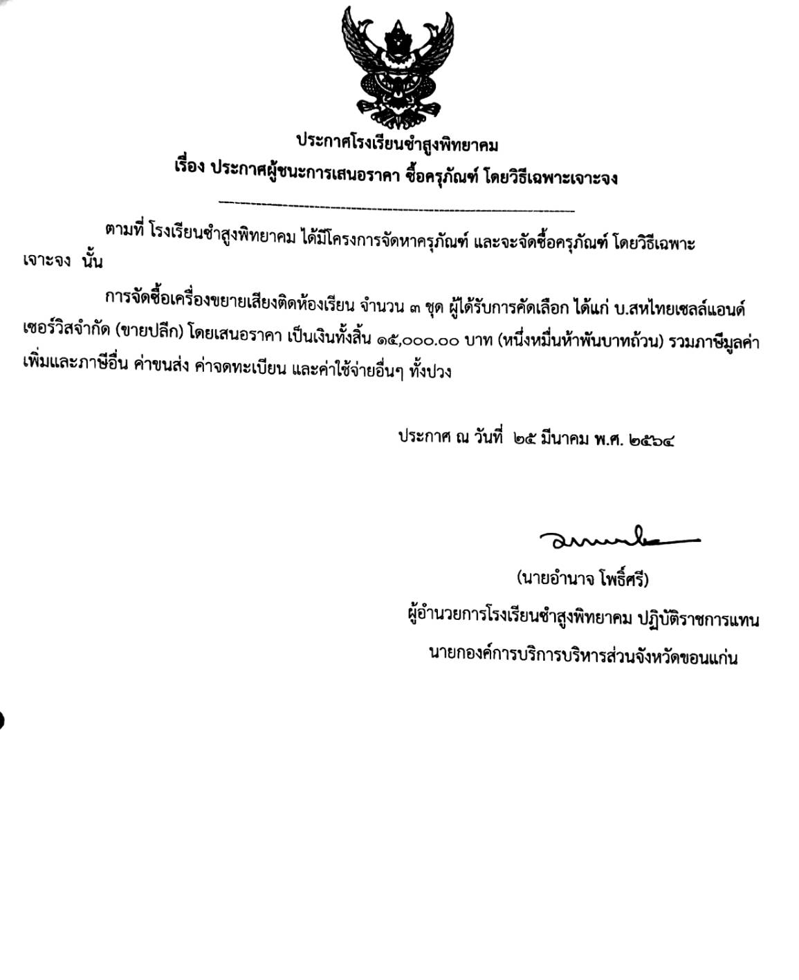 ประกาศโรงเรียนซำสูงพิทยาคม เรื่อง ประกาศผู้ชนะการเสนอราคา ซื้อครุภัณฑ์ โดยวิธีเฉพาะเจาะจง
