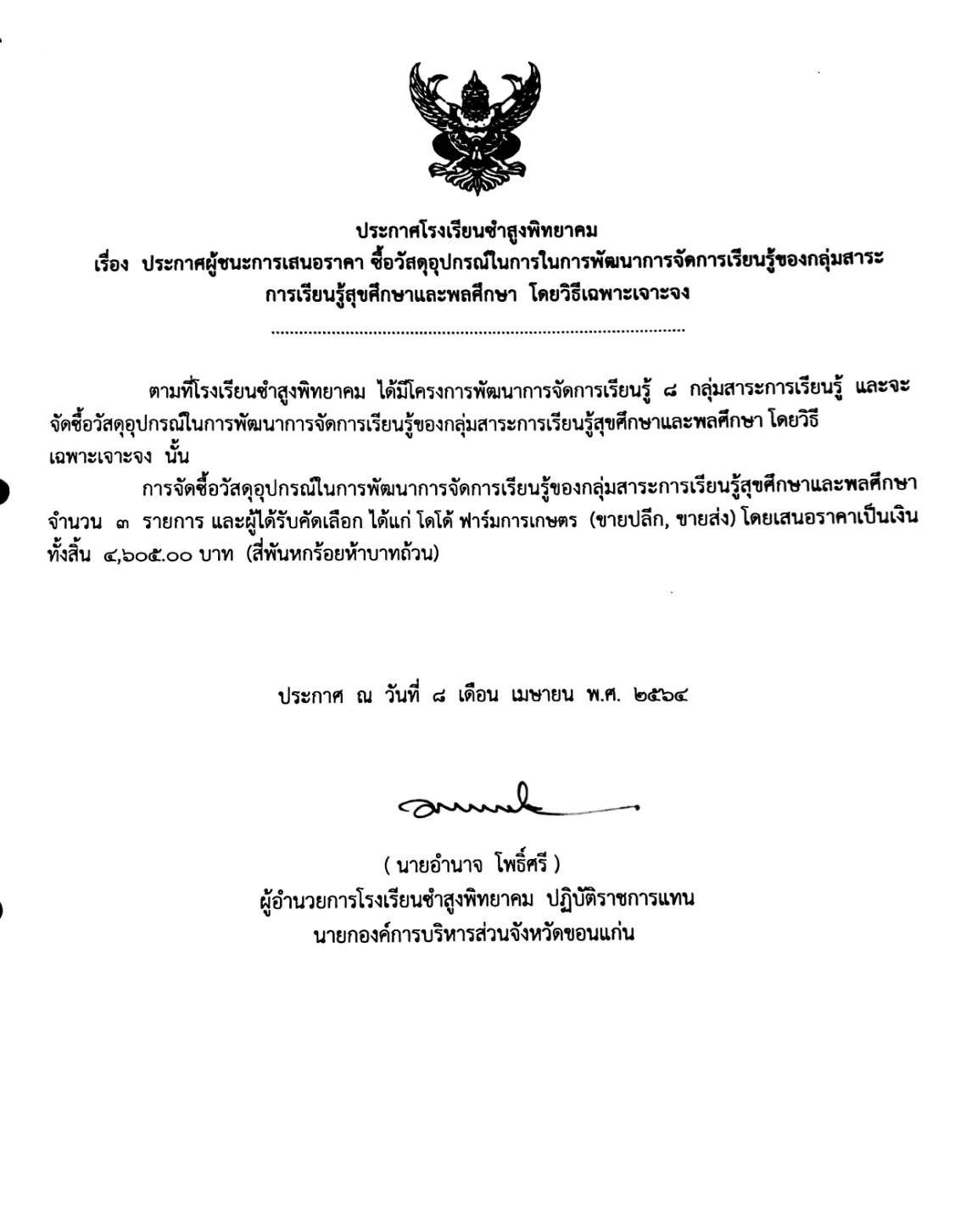 ประกาศโรงเรียนซำสูงพิทยาคม เรื่อง ประกาศผู้ชนะการเสนอราคา ซื้อวัสดุอุปกรณ์ในการพัฒนาการจัดการเรียนรู้กลุ่มสาระการเรียนรู้สุขศึกษาและพลศึกษา โดยวิธีเฉพาะเจาะจง