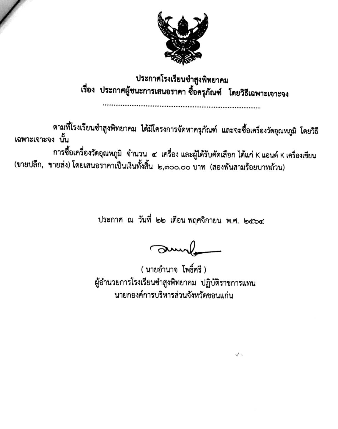 ประกาศโรงเรียนชำสูงพิทยาคม เรื่อง ประกาศผู้ชนะการเสนอราคา ซื้อครุภัณฑ์ โดยวิธีเฉพาะเจาะจง
