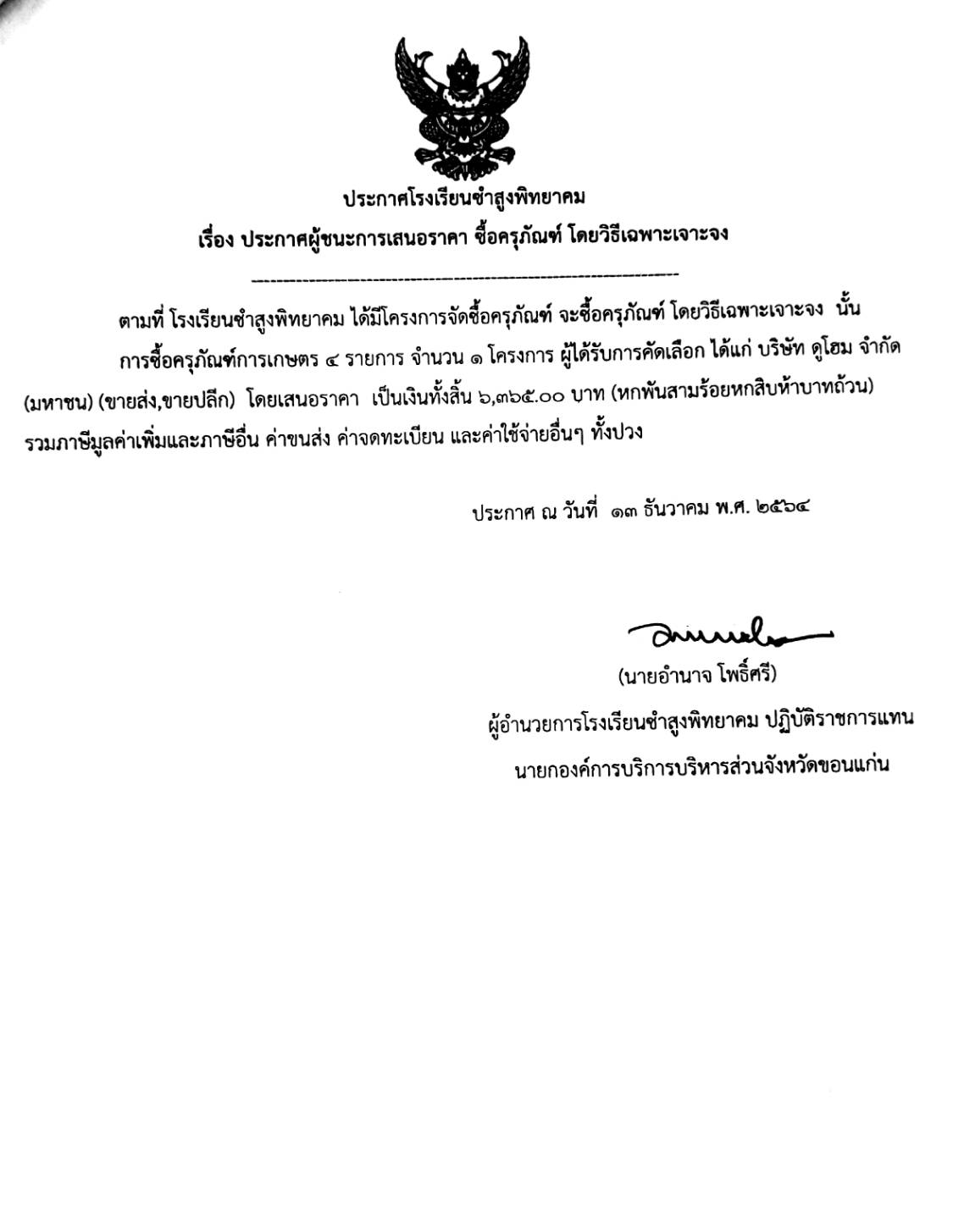 ประกาศโรงเรียนซำสูงพิทยาคม เรื่อง ประกาศผู้ชนะการเสนอราคา ซื้อครุภัณฑ์ โดยวิธีเฉพาะเจาะจง