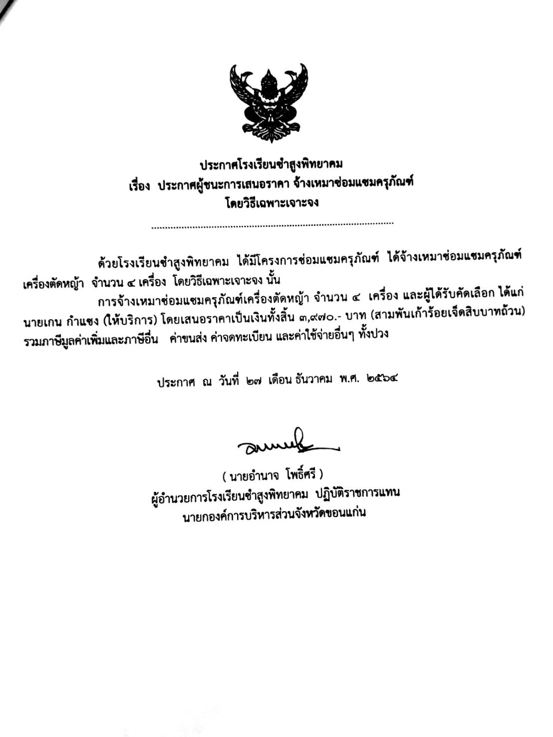 ประกาศโรงเรียนซำสูงพิทยาคม เรื่อง ประกาศผู้ชนะการเสนอราคา จ้างเหมาซ่อมแชมครุภัณฑ์ โดยวิธีเฉพาะเจาะจง