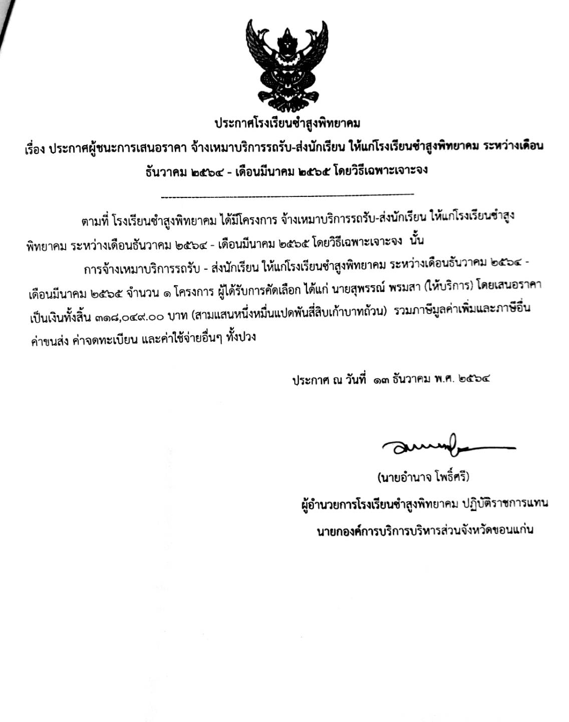 ประกาศโรงเรียนซำสูงพิทยาคม เรื่อง ประกาศผู้ชนะการเสนอราคา จ้างเหมาบริการรถรับ-ส่งนักเรียน ให้แก่โรงเรียนซำสูงพิทยาคม ระหว่างเดือน ธันวาคม ๒๕๖๔ - เดือนมีนาคม ๒๕๖๕ โดยวิธีเฉพาะเจาะจง