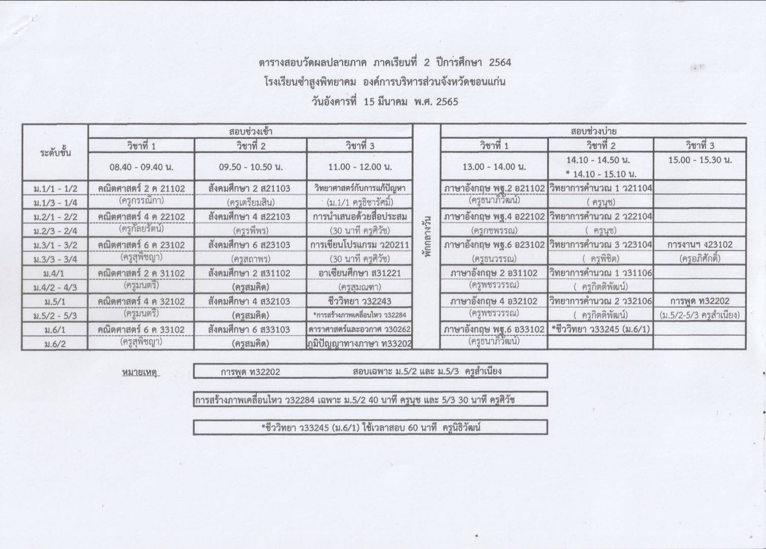ตารางสอบวัดผลปลายภาคเรียนที่ 2 ปีการศึกษา 2564 ระหว่างวันที่ 14-15 มีนาคม 2565