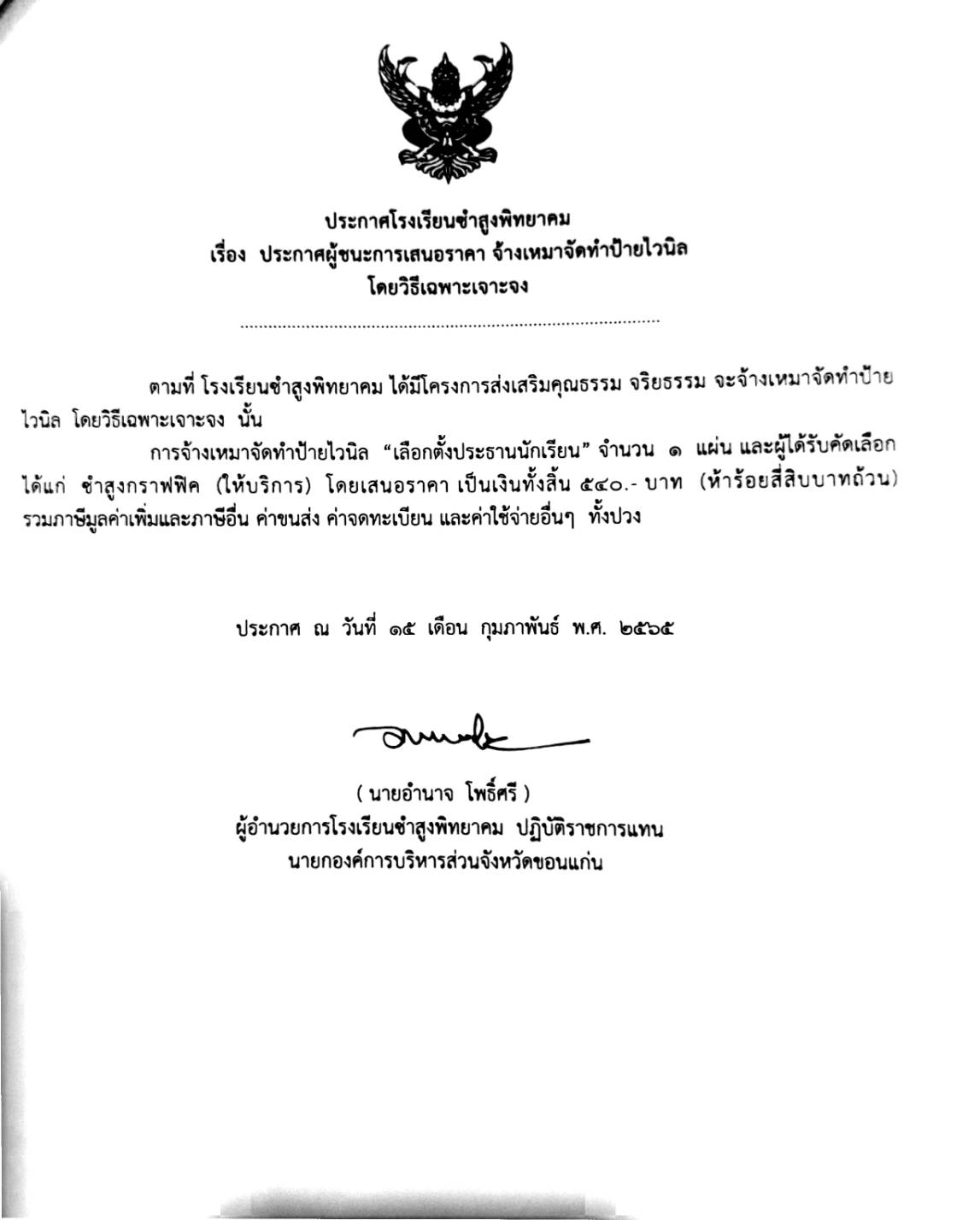 ประกาศโรงเรียนซำสูงพิทยาคม เรื่อง ประกาศผู้ชนะการเสนอราคา จ้างเหมาจัดทำป้ายไวนิล โดยวิธีเฉพาะเจาะจง