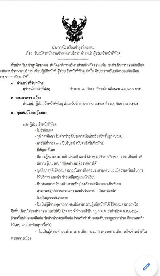 ประกาศโรงเรียนชำสูงพิทยาคม เรื่อง รับสมัครพนักงานจ้างเหมาบริการ ตำแหน่ง ผู้ช่วยเจ้าหน้าที่พัสดุ