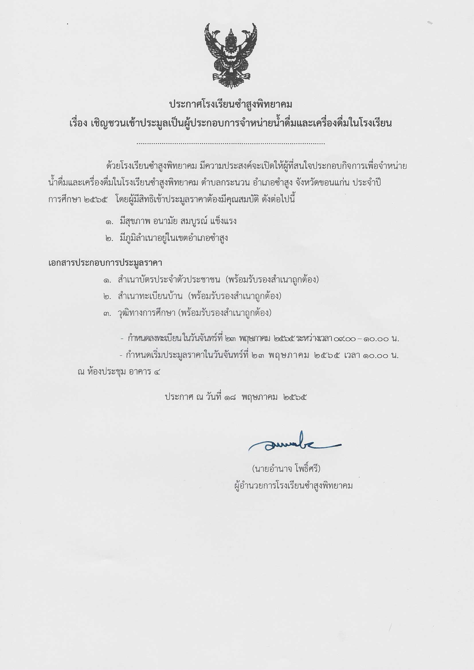ประกาศโรงเรียนซำสูงพิทยาคม เรื่อง เชิญชวนเข้าประมูลเป็นผู้ประกอบการจำหน่ายน้ำดื่มและเครื่องดื่มในโรงเรียน