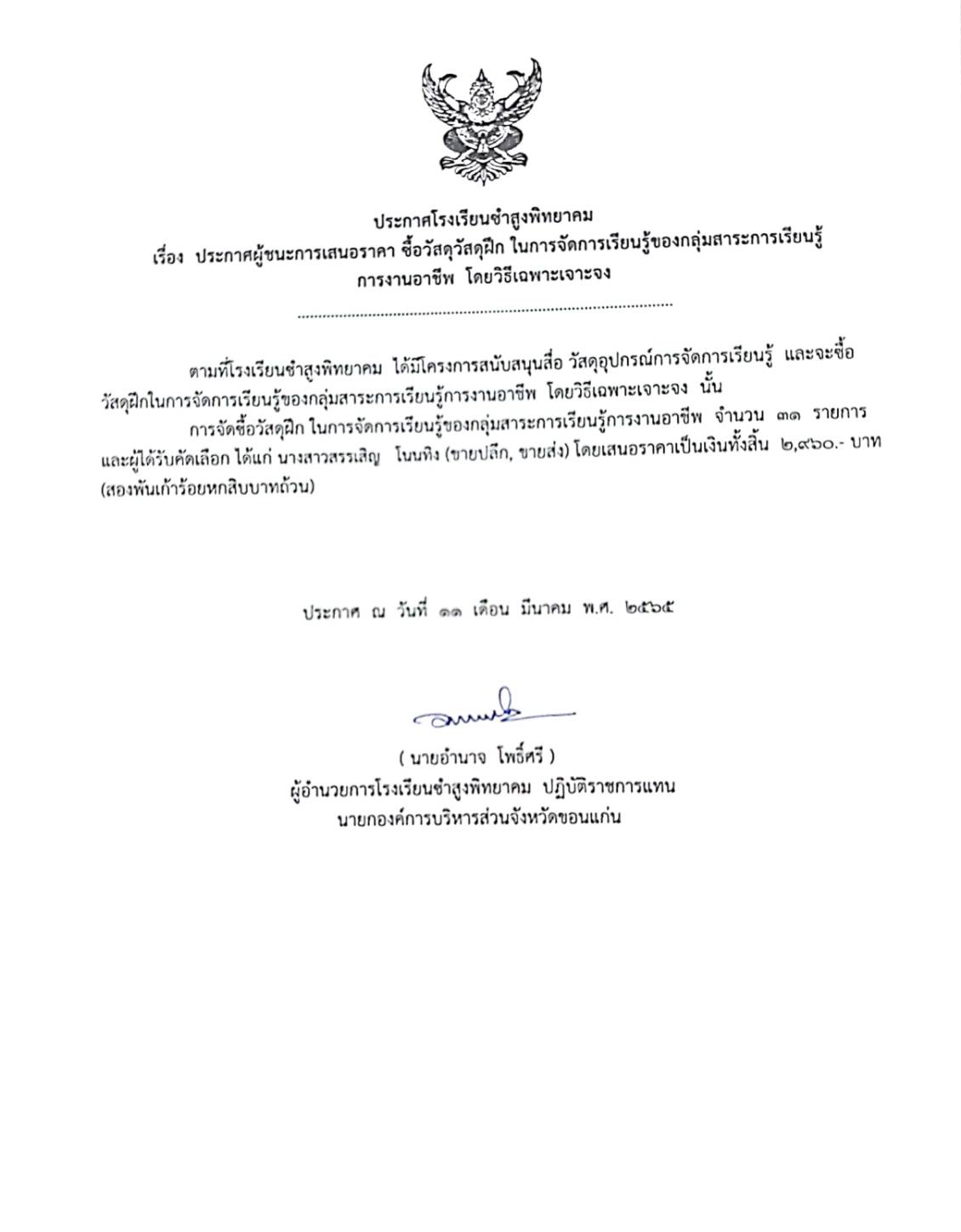 ประกาศโรงเรียนยำสูงพิทยาคม เรื่อง ประกาศผู้ชนะการเสนอราคา ซื้อวัสดุวัสดุฝึก ในการจัดการเรียนรู้ของกลุ่มสาระการเรียบรู้ การงานอาชีพ โดยวิธีเฉพาะเจาะจง